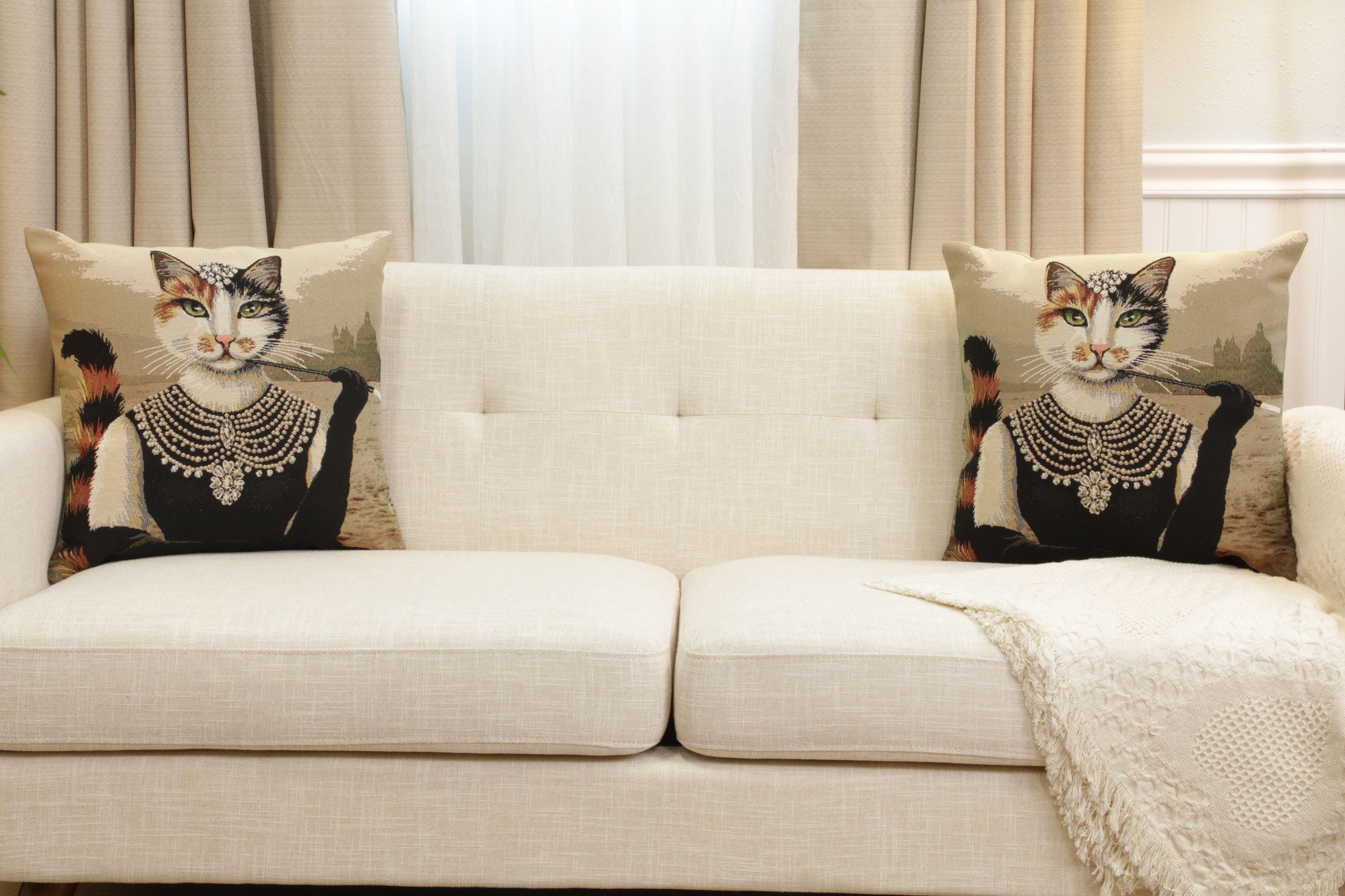 Bring a touch of whimsy and elegance to your living space with the Denise Cat Woven Cushion Cover. This beautifully crafted tapestry pillow cover features a charming cat design, expertly woven to capture every intricate detail. Perfect for cat lovers or those looking to add a playful yet sophisticated accent to sofas, armchairs, or beds, this 18x18-inch cushion cover blends timeless artistry with modern home dรฉcor sensibilities.