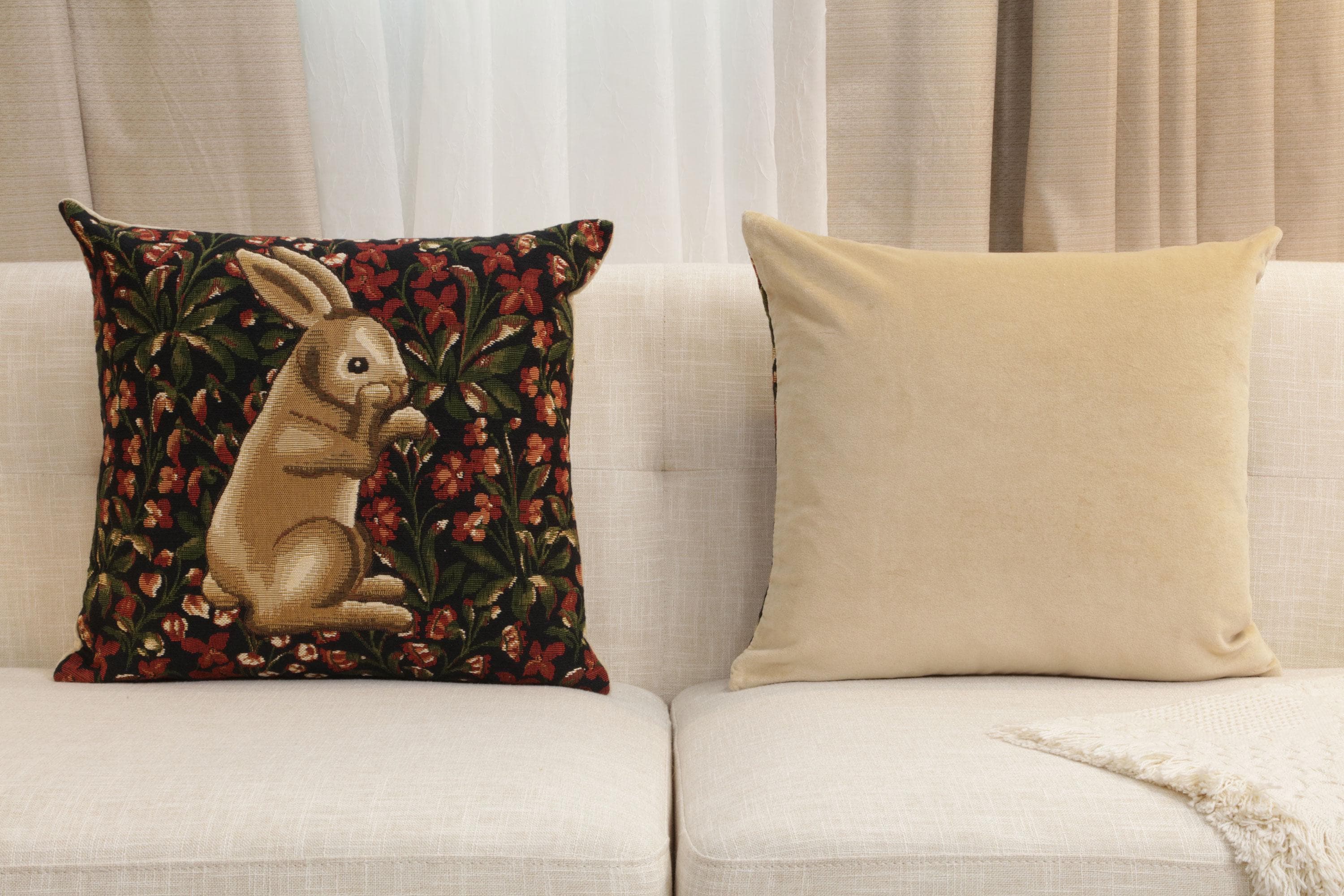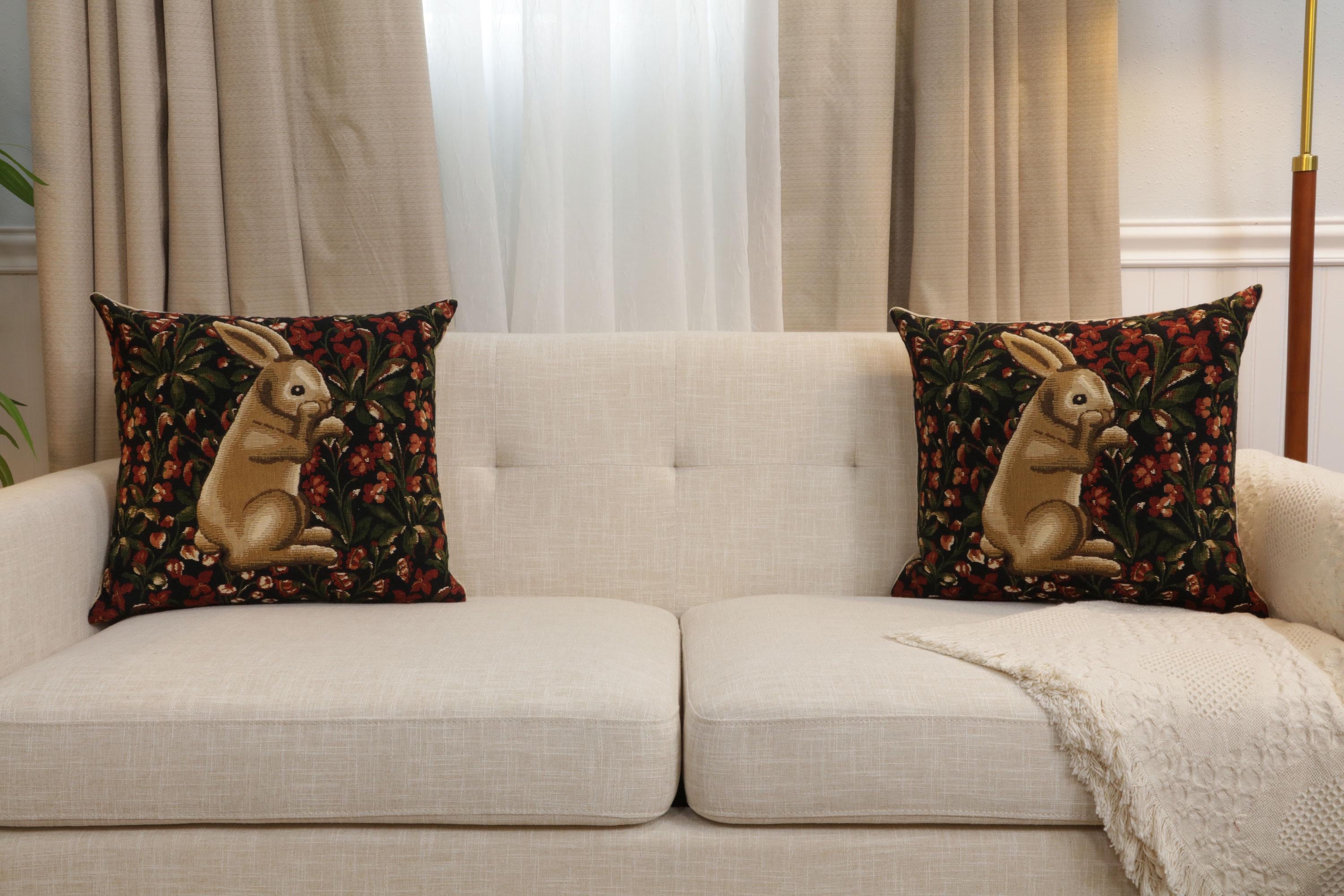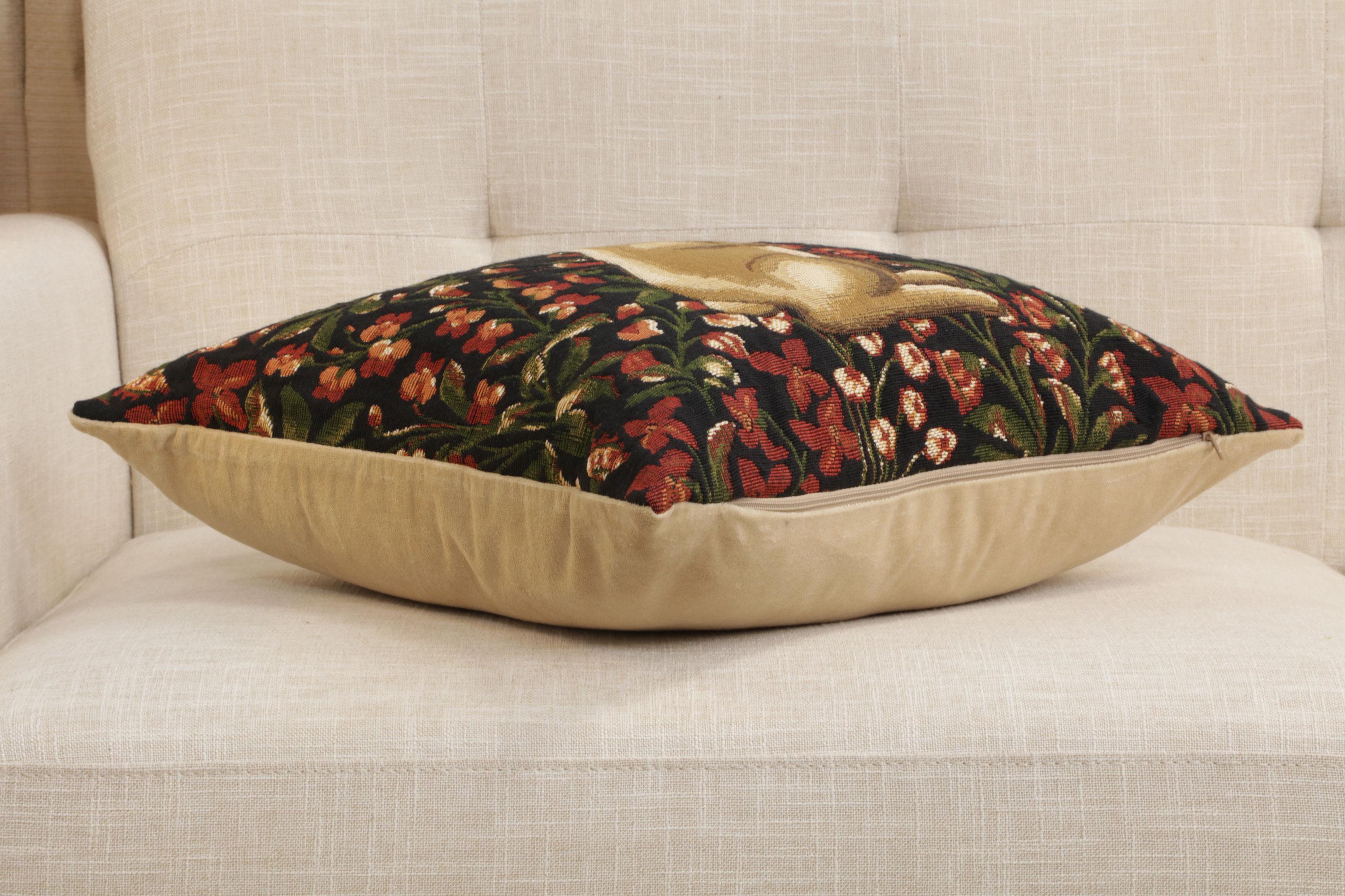 Add a touch of heritage and artistry to your home with the Vintage Belgian Tapestry Cushion Cover, featuring a charming Medieval Rabbit Amidst a Floral Garden design. Expertly woven in Belgium, this cushion cover revives the traditional craftsmanship of European tapestries, offering exquisite detail, depth, and elegance. The intricate floral pattern surrounding the gentle rabbit creates a serene and timeless scene that enriches any room with sophistication.