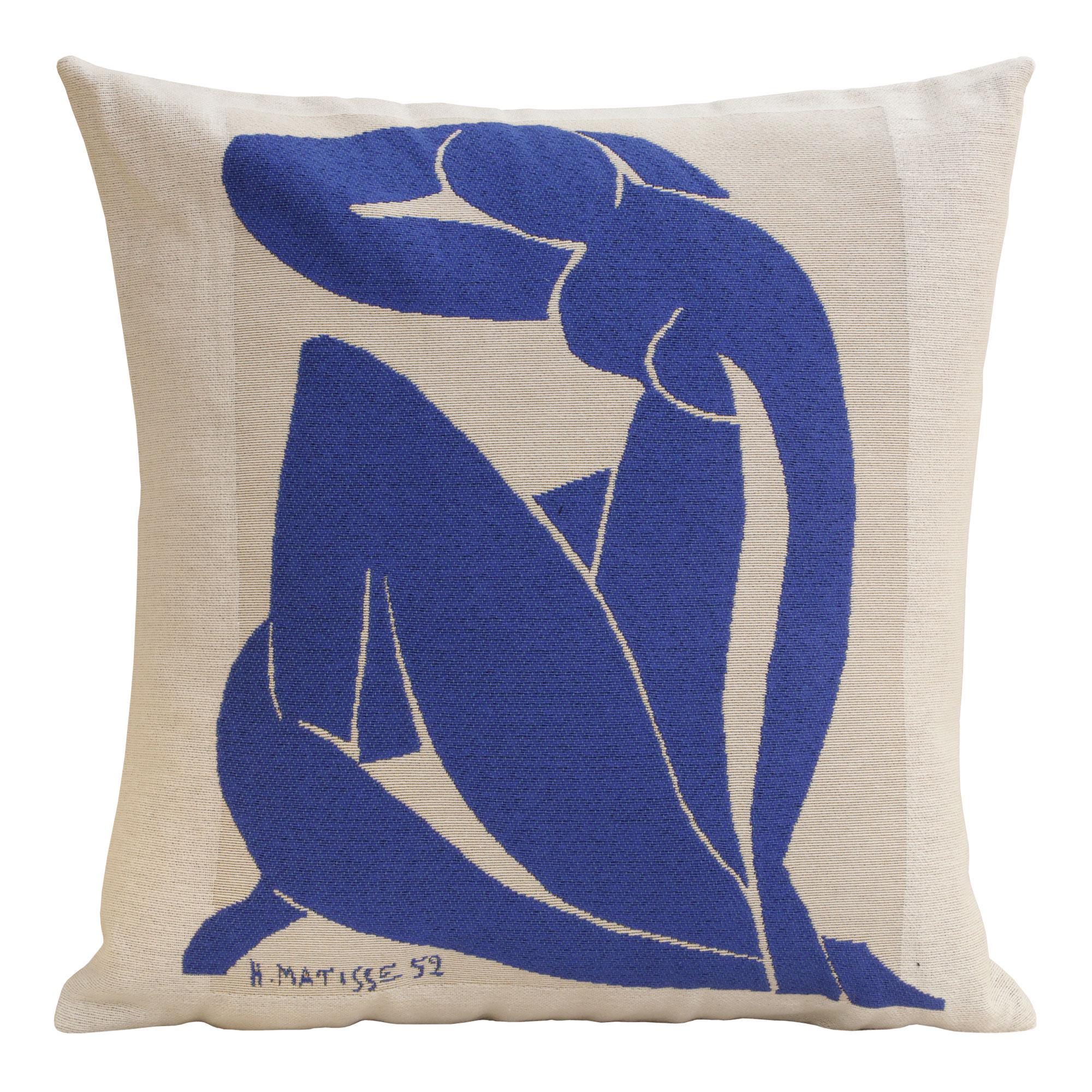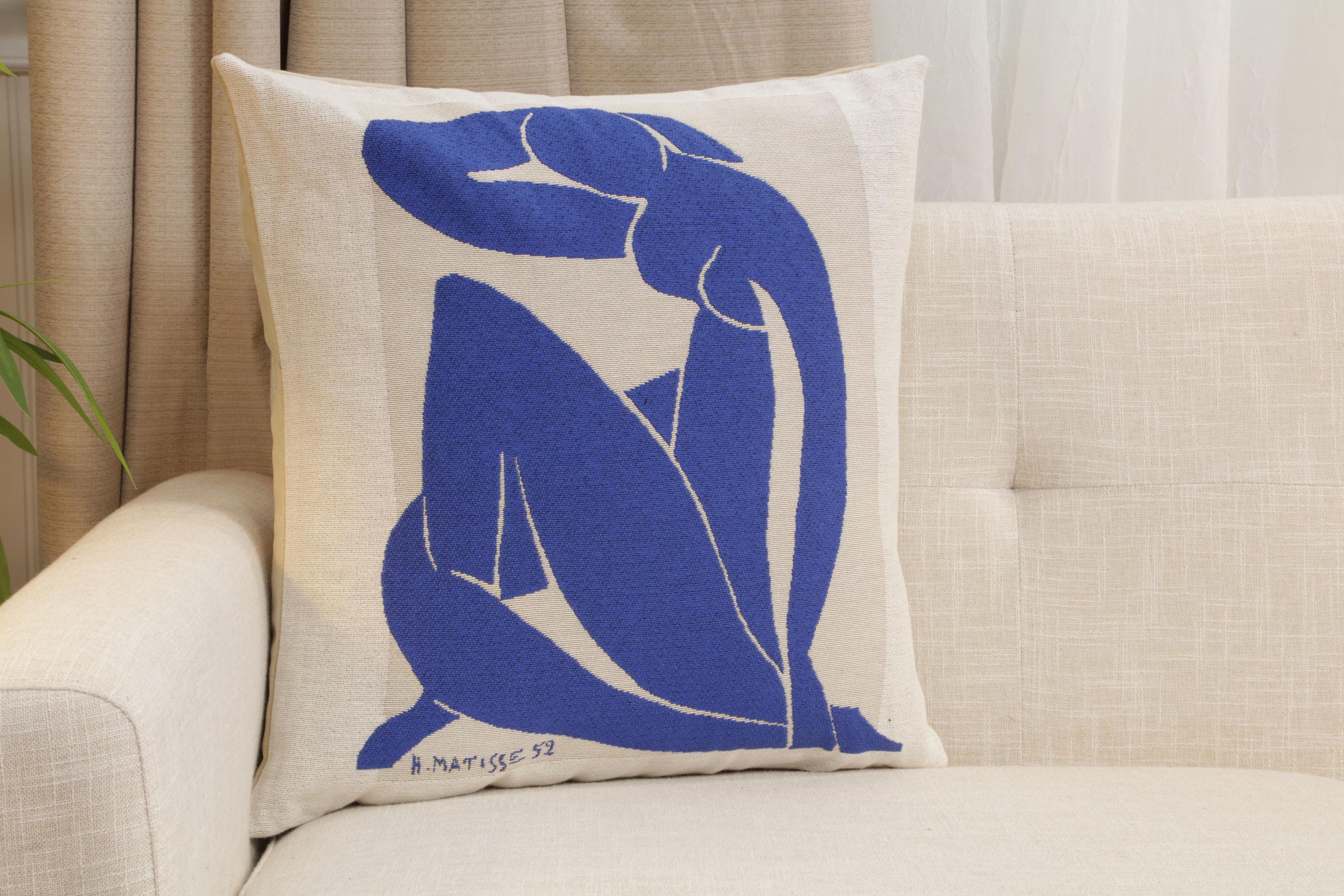 "Add a bold artistic statement to your space with this Matisse blue figure cushion cover, a modern art inspired Belgian woven jacquard design featuring a minimalist female silhouette in rich blue tones. Inspired by Henri Matisse’s iconic cut-out style, this decorative throw pillow cover blends abstract art, contemporary aesthetics, and European craftsmanship, making it a perfect accent for modern interiors, artistic homes, and stylish living spaces.