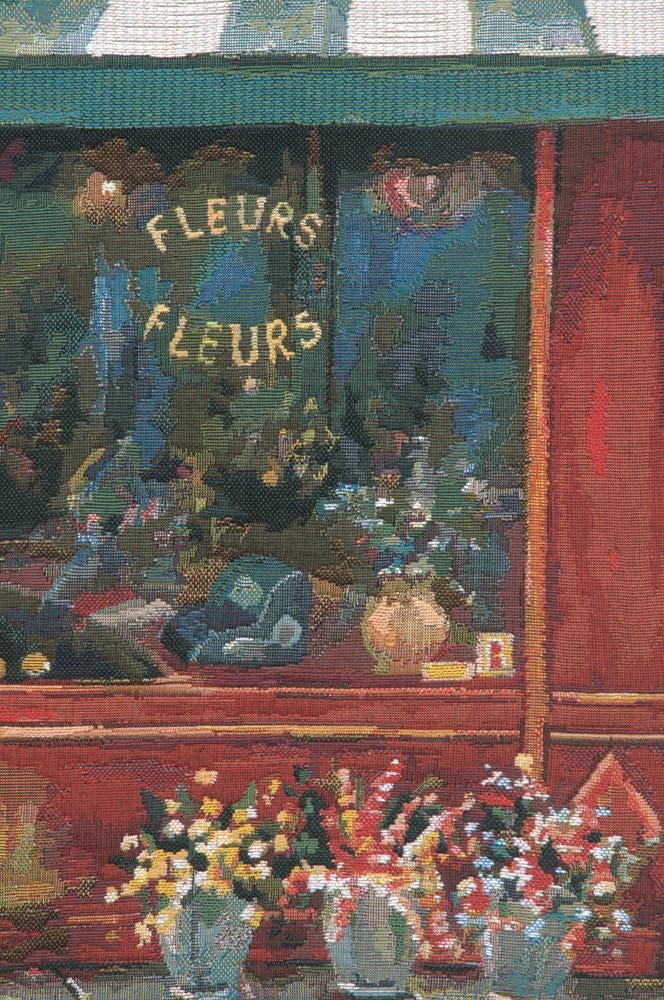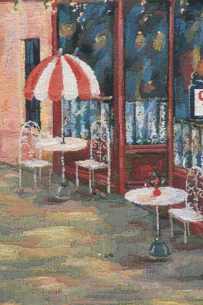 Luchon Terrasse, or Terrace in Luchon is a Belgian made jacquard wall tapestries. This cheerful artwork features a quaint village street in France. A music shop and flower shop flank the central entrance to the inner shops beyond. Such streetscapes have long been the subject matter for artists enchanted by the charm of Parisian streets. The light is dappled as it hits the paved street and stone pavement of the arcade