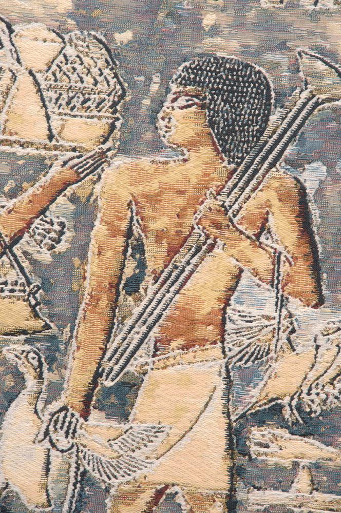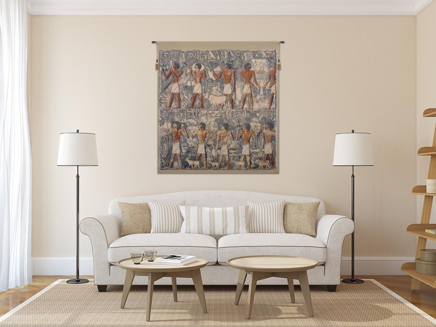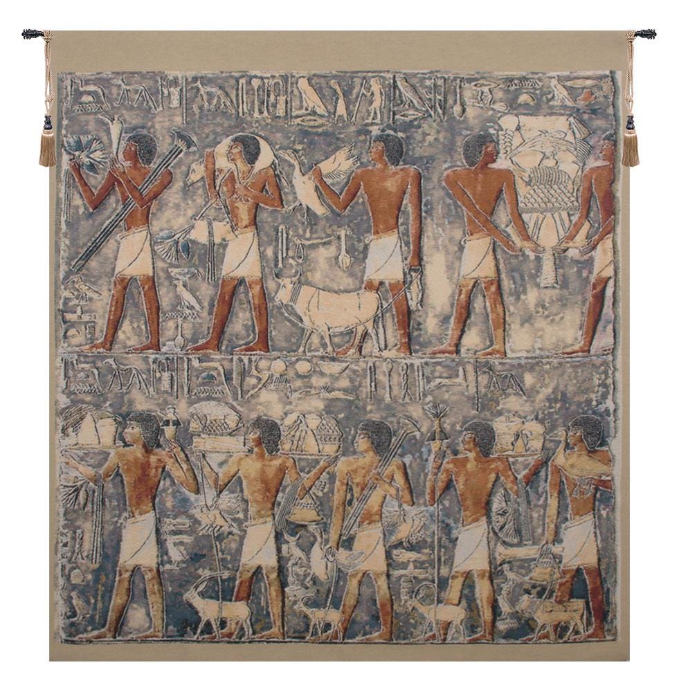 Saqqarah Blue, is a jacquard wall tapestry woven in Belgium. It represents the giving of sacrifices to the deceased Pharoh. The original artwork is displayed on the tomb of Ptahotep (or Ptah-hotep) in Sakkarah. It dates from the Ancient Empire (2650-2150 BCE "before the Common Era"). Saqqara (or Sakkara, Saqqarah, Sakkarah) is a vast, ancient burial ground in Egypt, featuring the world's oldest standing step pyramid. This is the perfect wall art for the avid historian in your life.