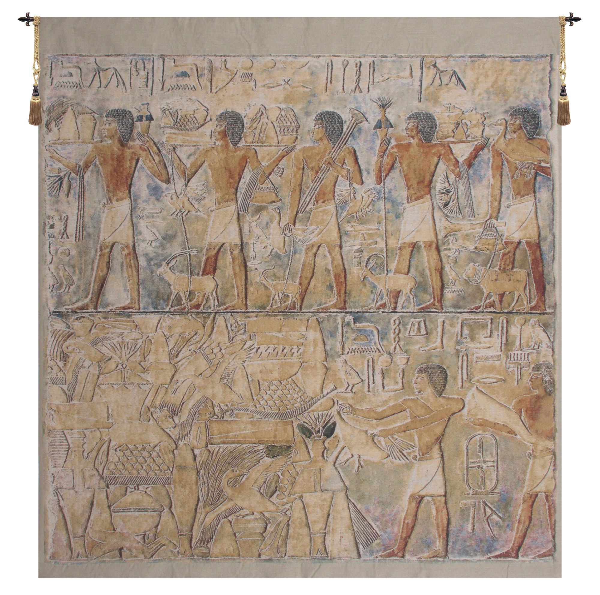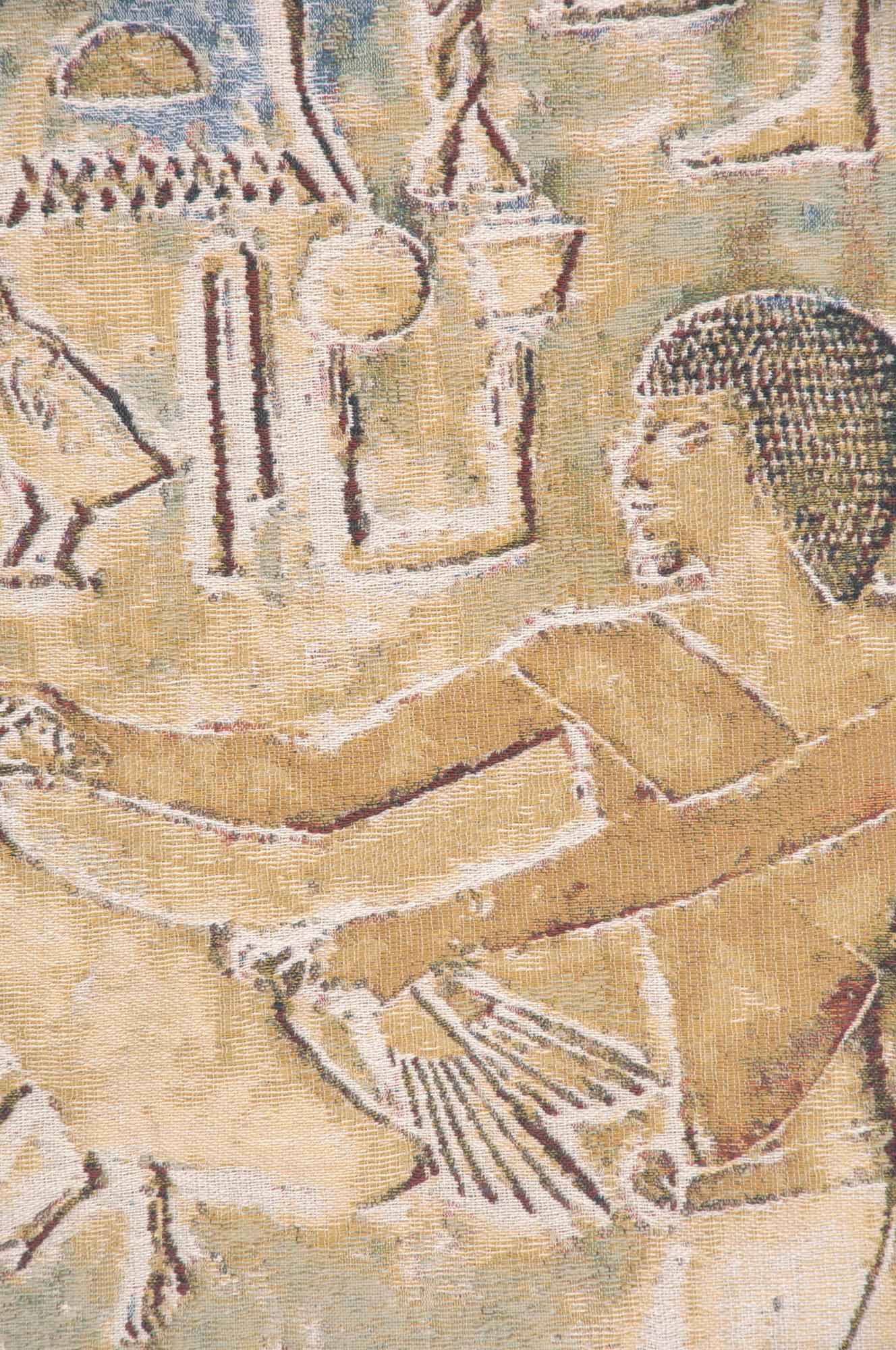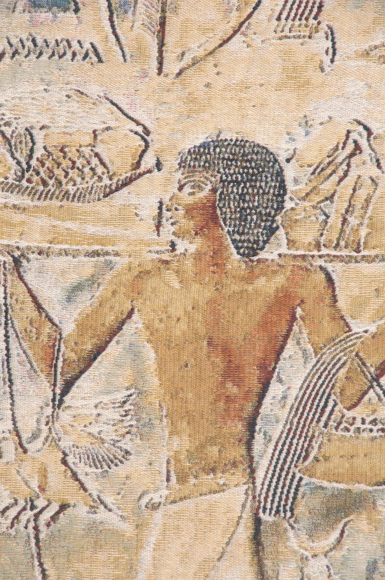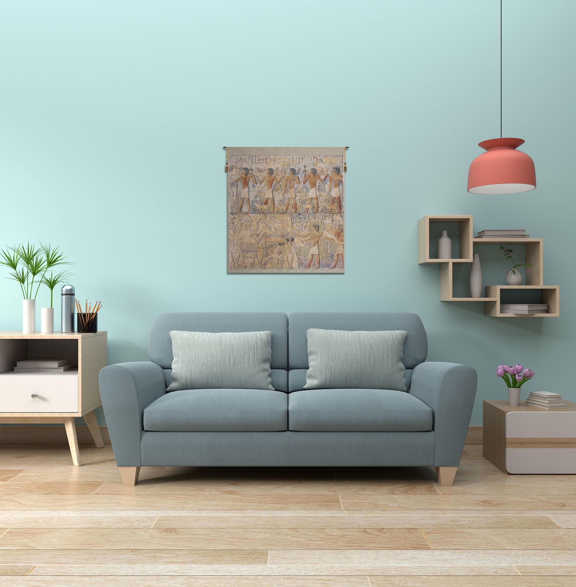 Saqqarah Beige Carre, is jacquard woven wall art tapestry made in Belgium. It represents the giving of sacrifices to the deceased Pharoh. The original artwork is displayed on the tomb of Ptahotep (or Ptah-hotep) in Sakkarah. It dates from the Ancient Egyptian Empire 2650-2150 BCE. Saqqara (or Sakkara, Saqqarah, Sakkarah) is a vast, ancient burial ground in Egypt, featuring the world's oldest standing step pyramid. A fine addition to your home decor motif.