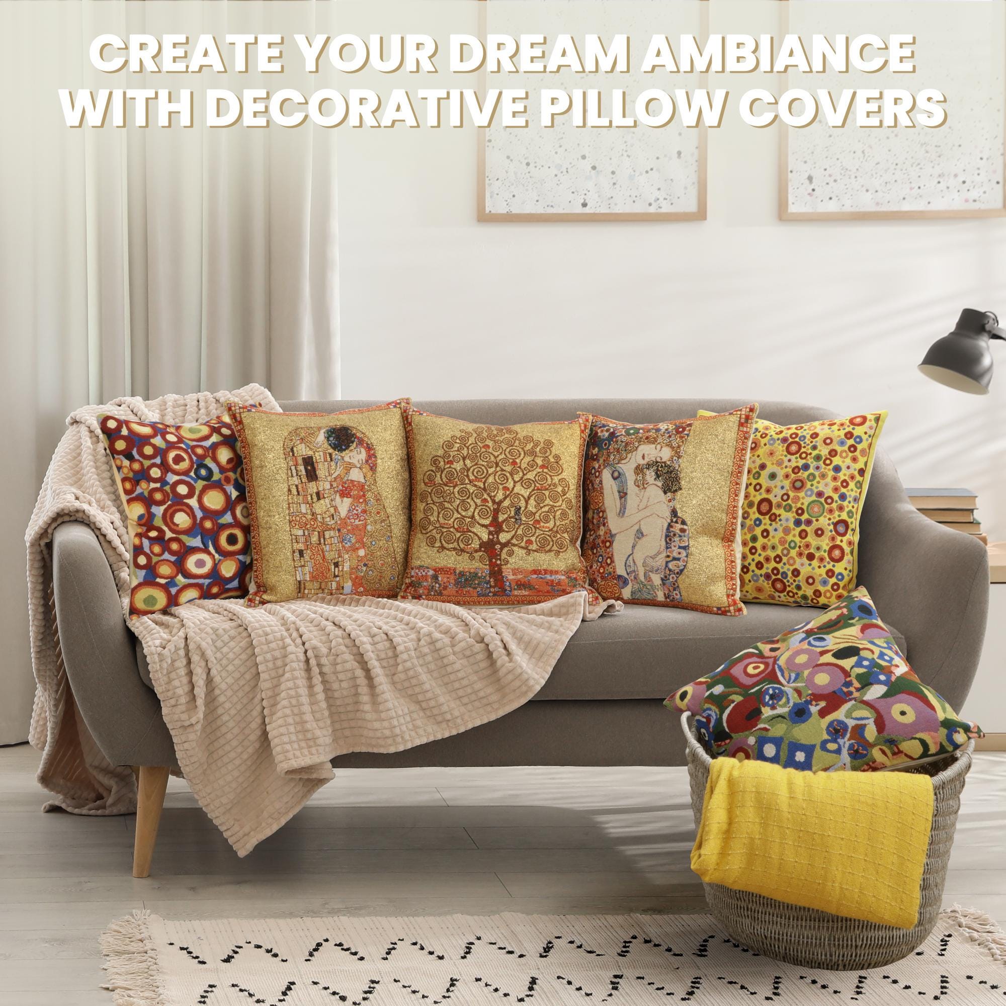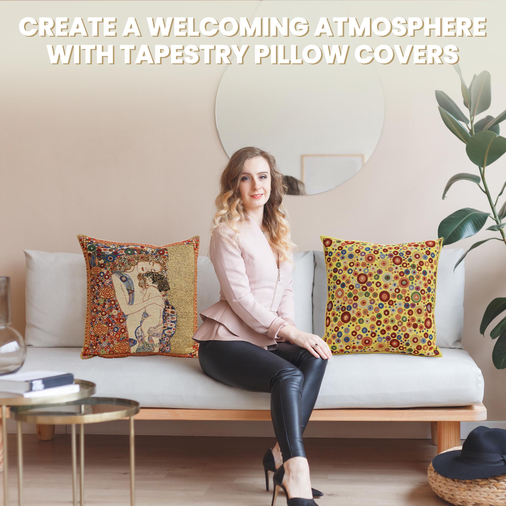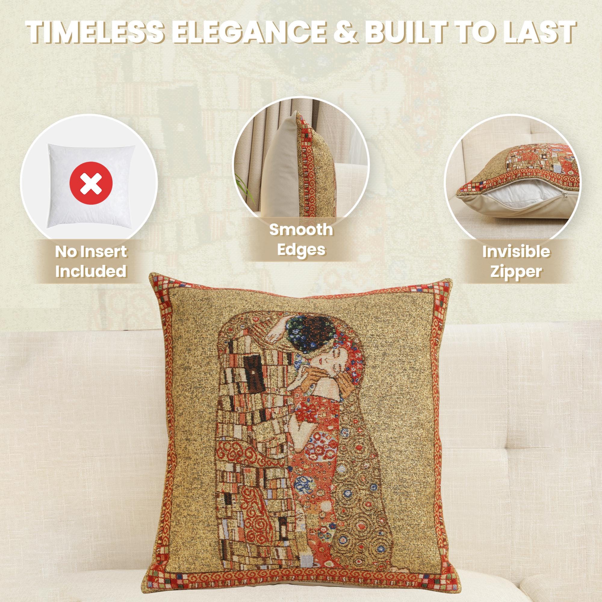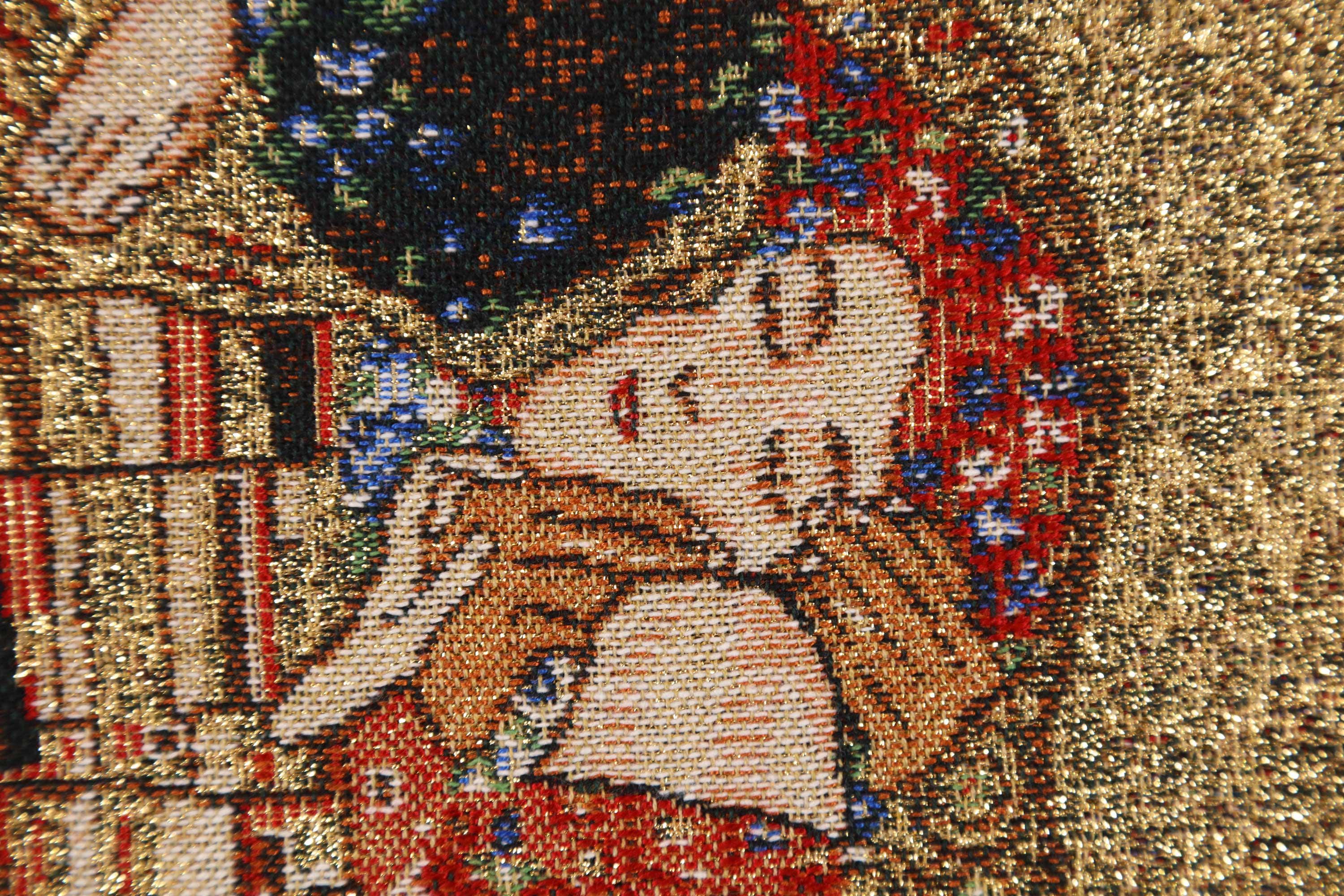 Infuse your home with romance and sophistication with the Le Baiser by Klimt Tapestry Cushion Covers, inspired by Klimtโs iconic painting The Kiss. This throw pillow cover showcases two lovers in a tender embrace, surrounded by a mosaic of flowers and ornaments.