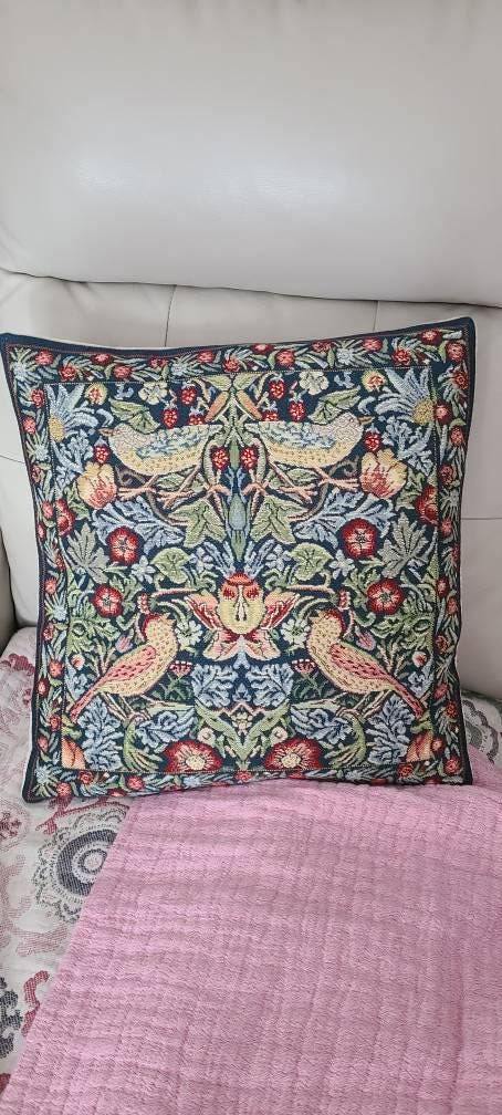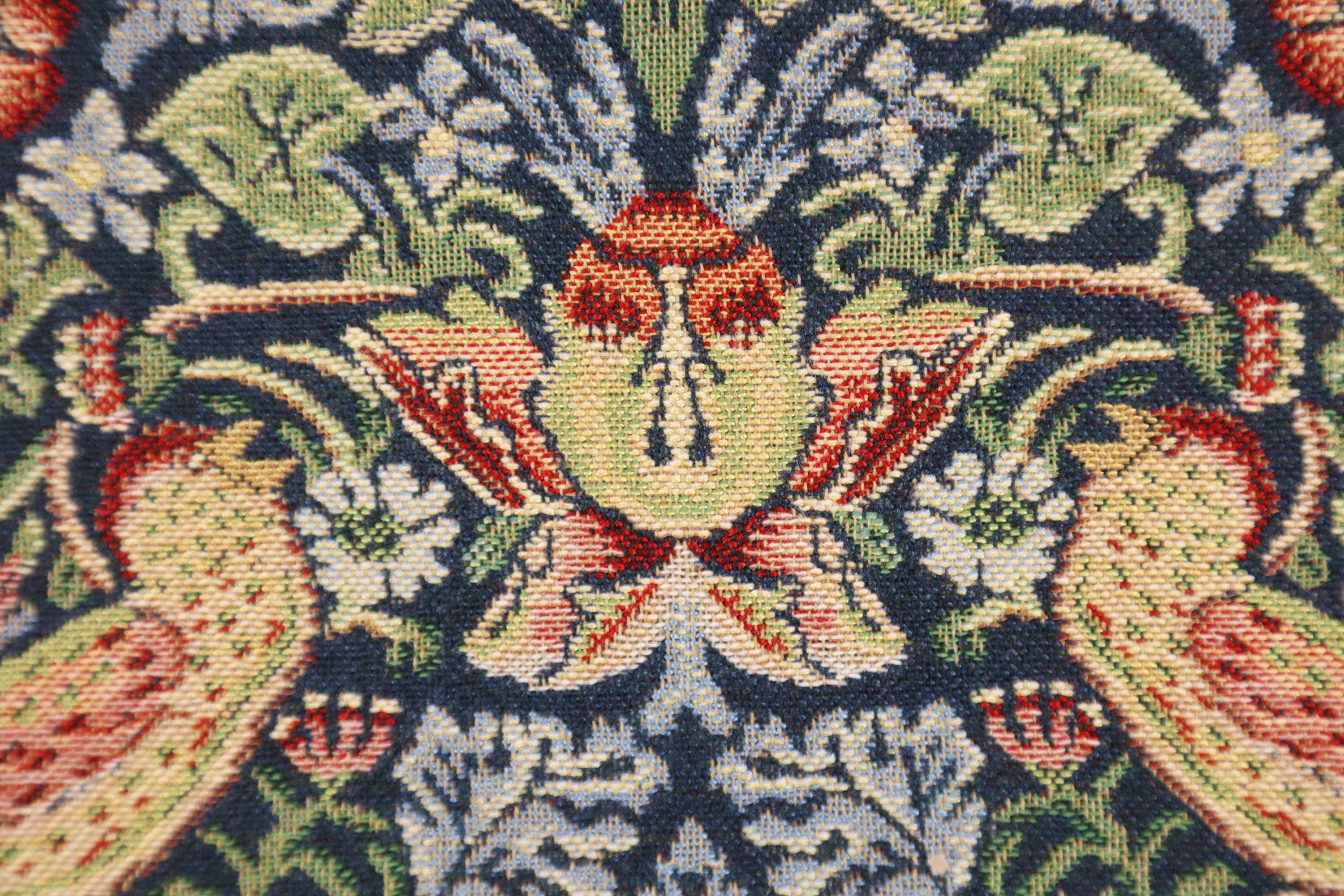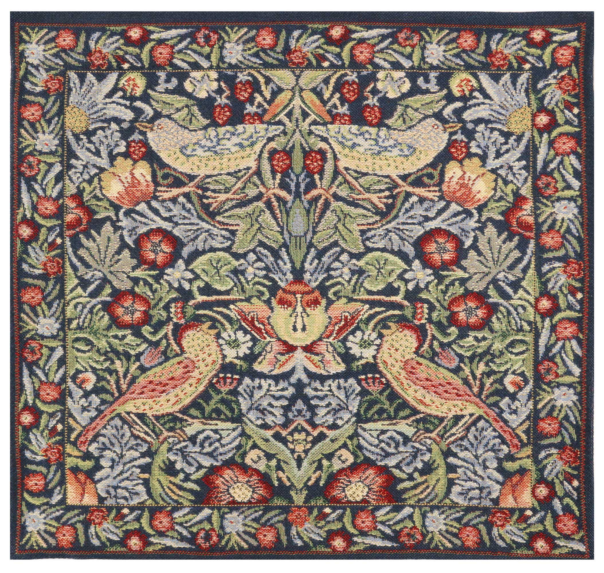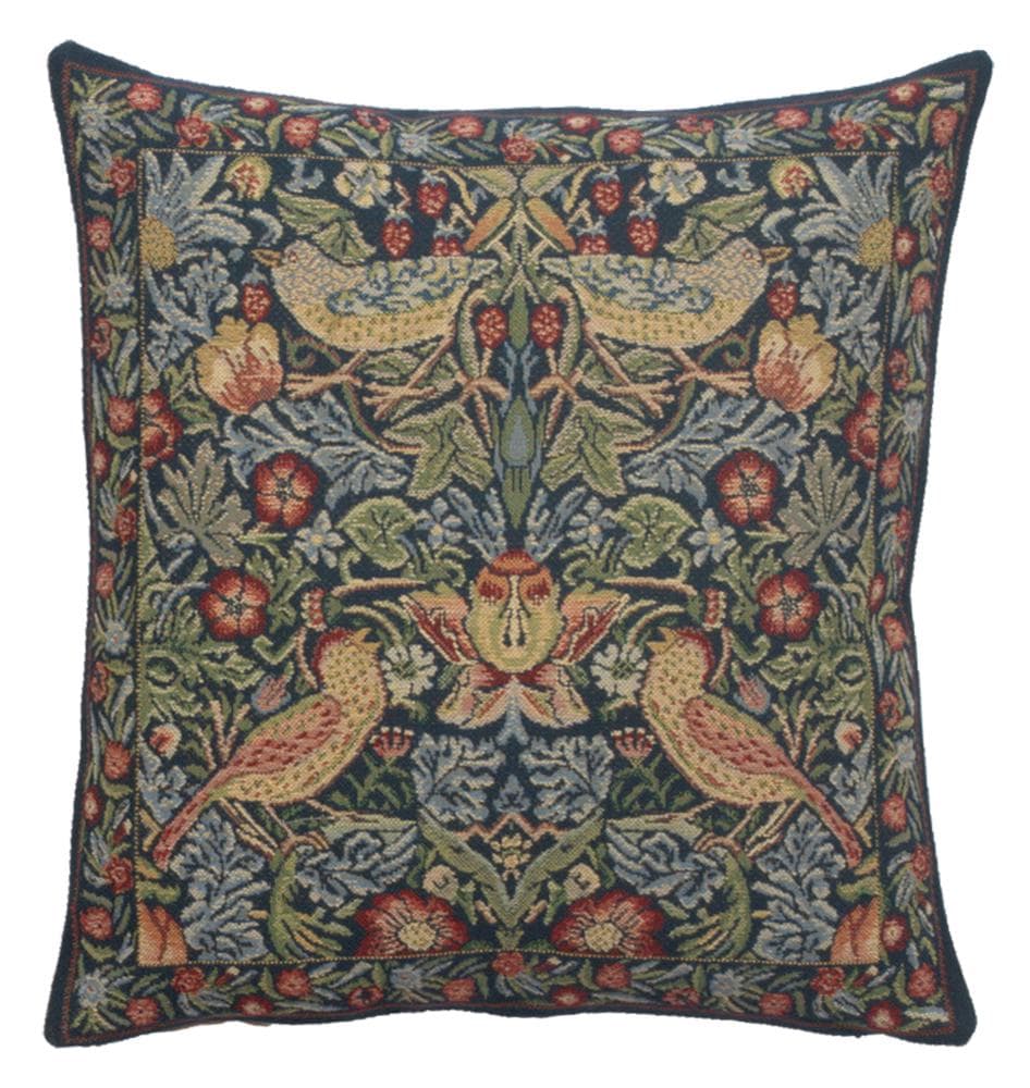 The tapestry on this William Morris Art Cushion Cover displays chirpy and playful birds stealing some wild strawberries from the green vines. Everything is immaculately depicted on the dark green background.