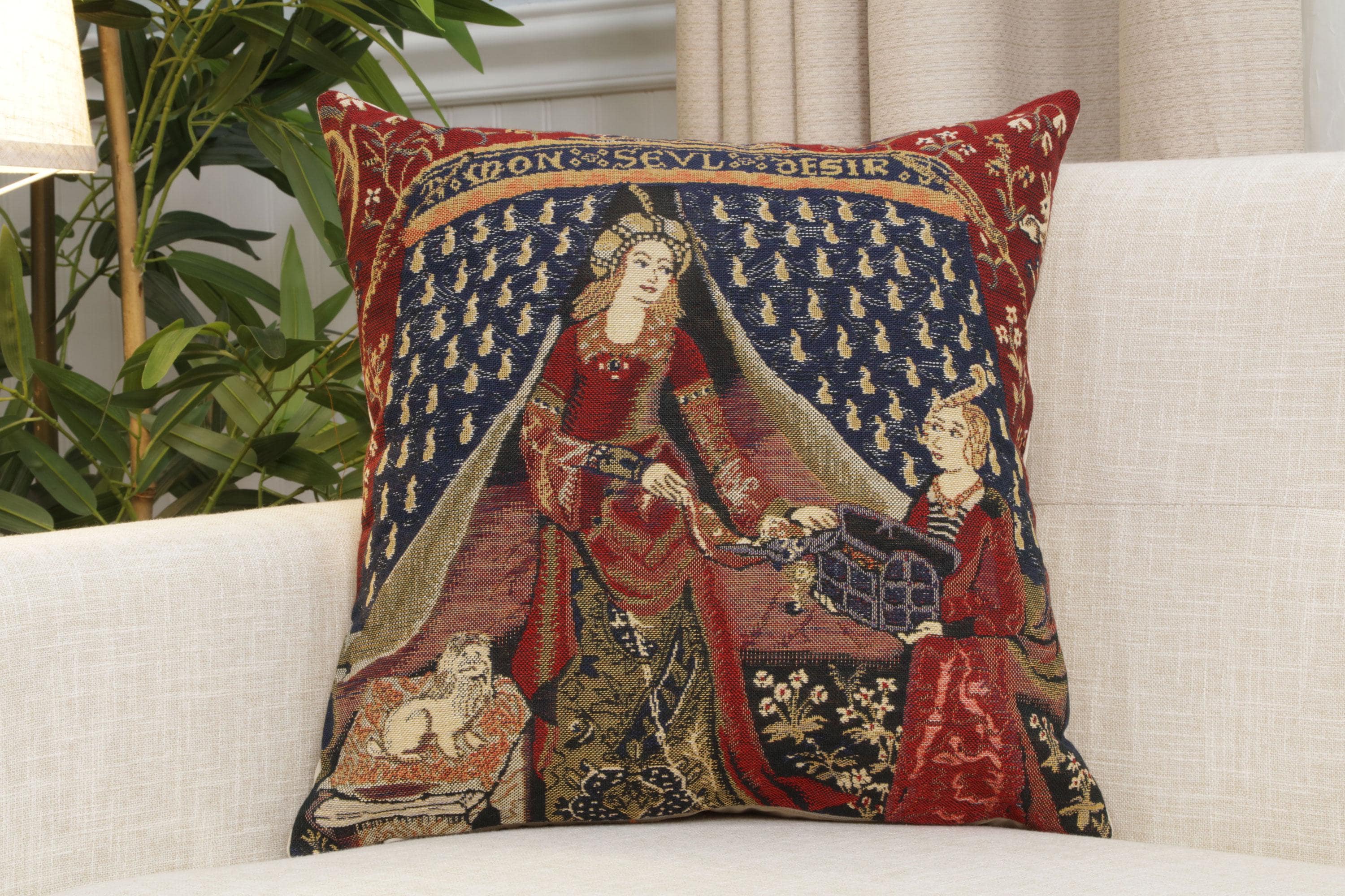 Experience medieval elegance with the My Only Desire decorative pillows cover, part of the legendary Lady and the Unicorn (La Dame ร la Licorne) series. This exquisite woven cushion showcases a lady standing in front of a tent inscribed with ""A Mon Seul Dรฉsir"" (To My Only Desire).Another sees the tapestry as representing a sixth sense of understanding. Other various interpretations see the tapestry as representing love or virginity.