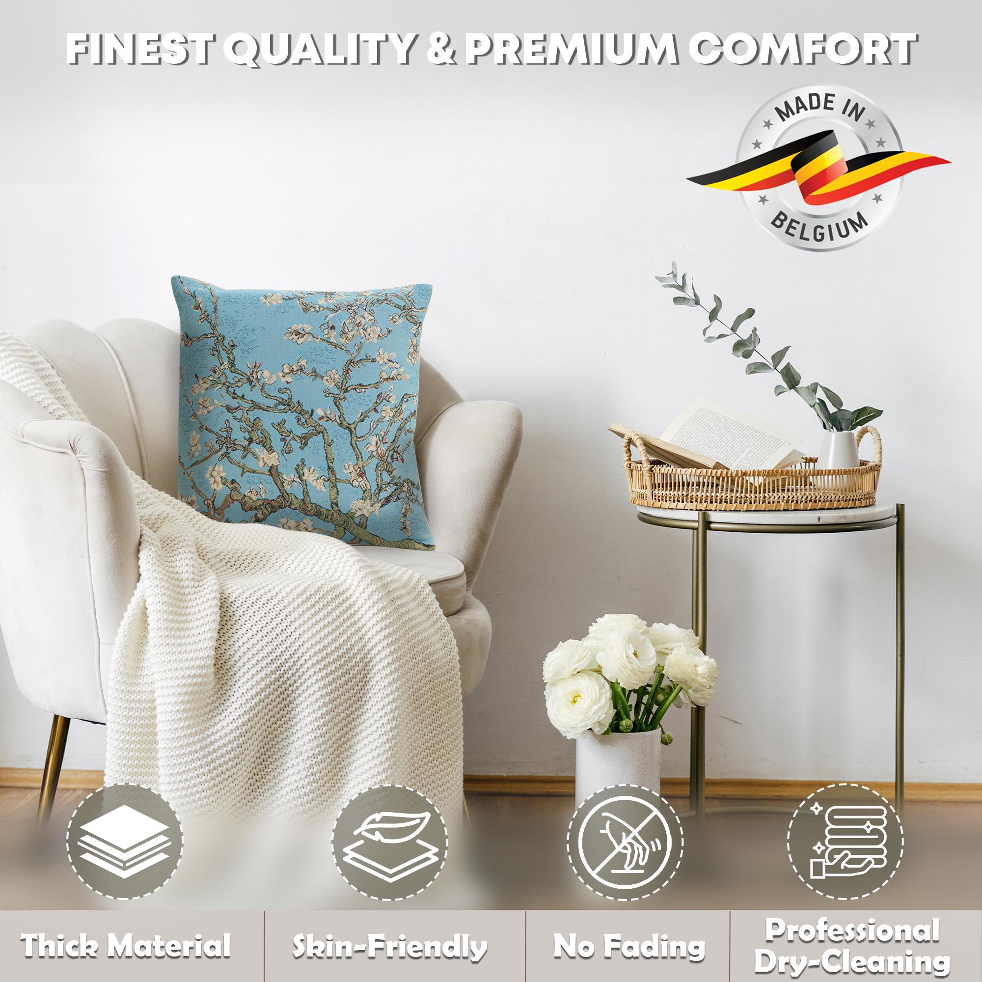 Bring elegance and tranquility to your living space with the Almond Blossom Tapestry Cushion Cover, a beautifully woven decorative pillow inspired by the serene beauty of blooming almond trees. Set against a soft sky-blue background, delicate white floral branches gently stretch across the surface, evoking a sense of calm, light, and natureโs renewal.