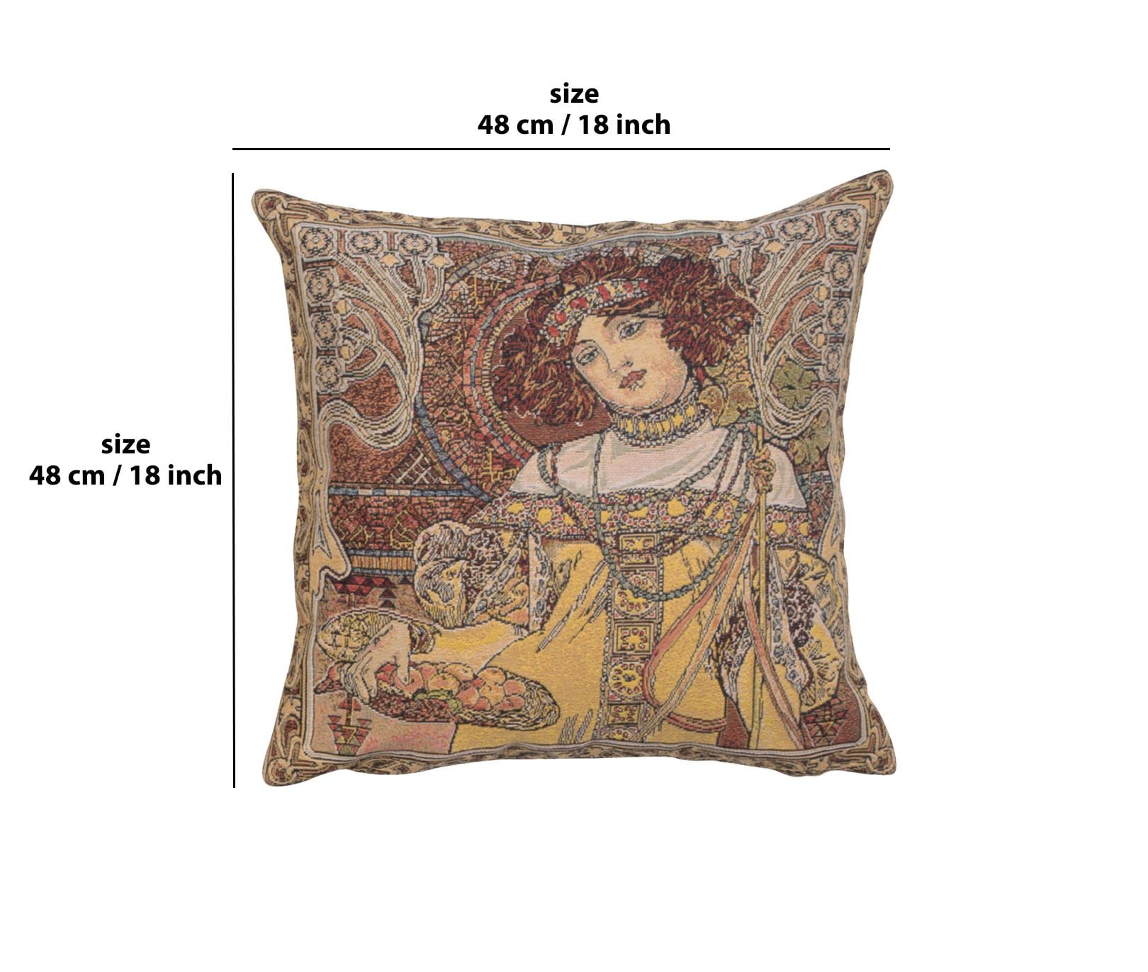 Mucha Autumn I woven European tapestry cushion cover features the work of artist Alphonse Mucha.