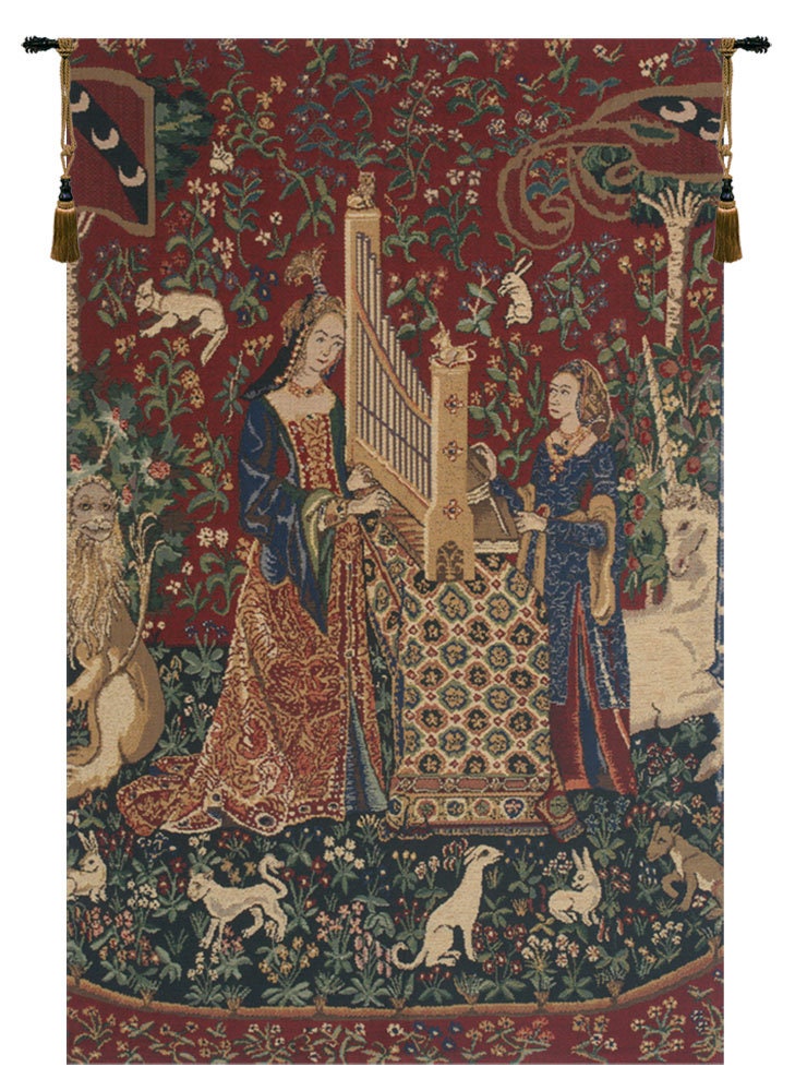 Discover the timeless beauty of the ""Lady and the Organ III"" Wall Art for Bedroom, an iconic piece from the celebrated ""Lady and the Unicorn"" series. Representing the sense of hearing, this exquisite woven wall hanging captures a serene scene of the lady playing a positive organ atop a richly detailed Turkish rug-covered table. Her maidservant stands gracefully opposite, holding the organ in place with quiet poise.