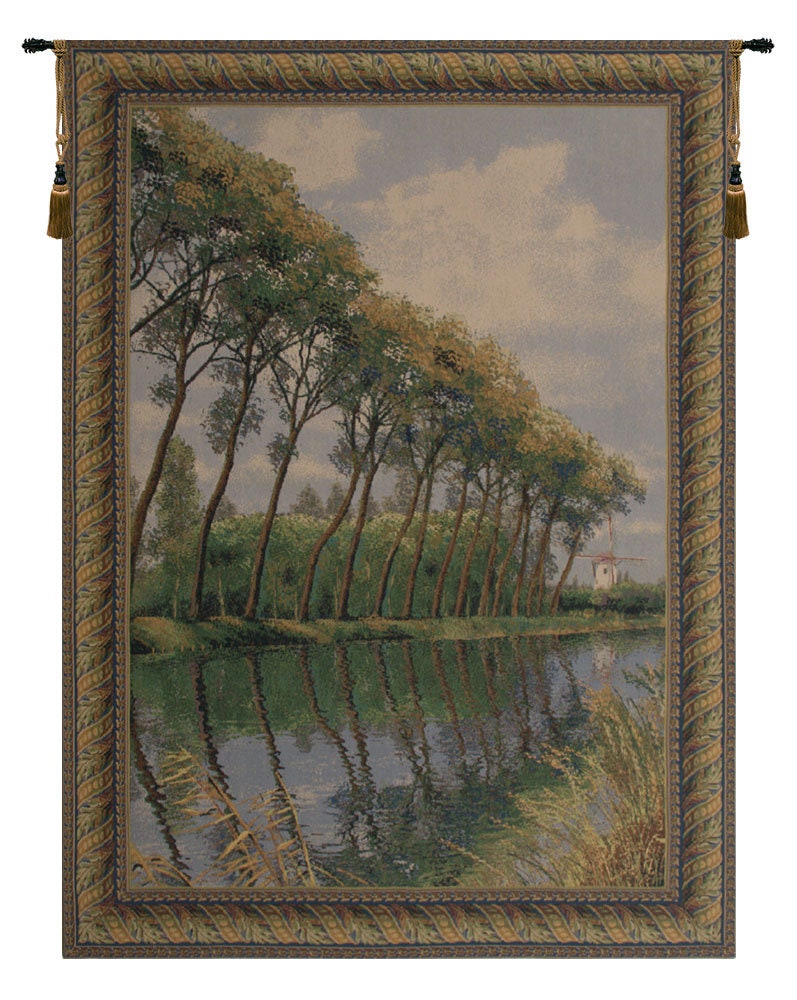 Canal in Flanders Mill is a jacquard woven wall art tapestry made in Belgium. It features a canal scene near Bruges reminiscent of a Pissarro painting. To create this tapestry, the artists have taken their inspiration from old documents. The row of bending trees is typical of a Flemish landscape. The imagery of this tapestry brings out the beauty of any home.