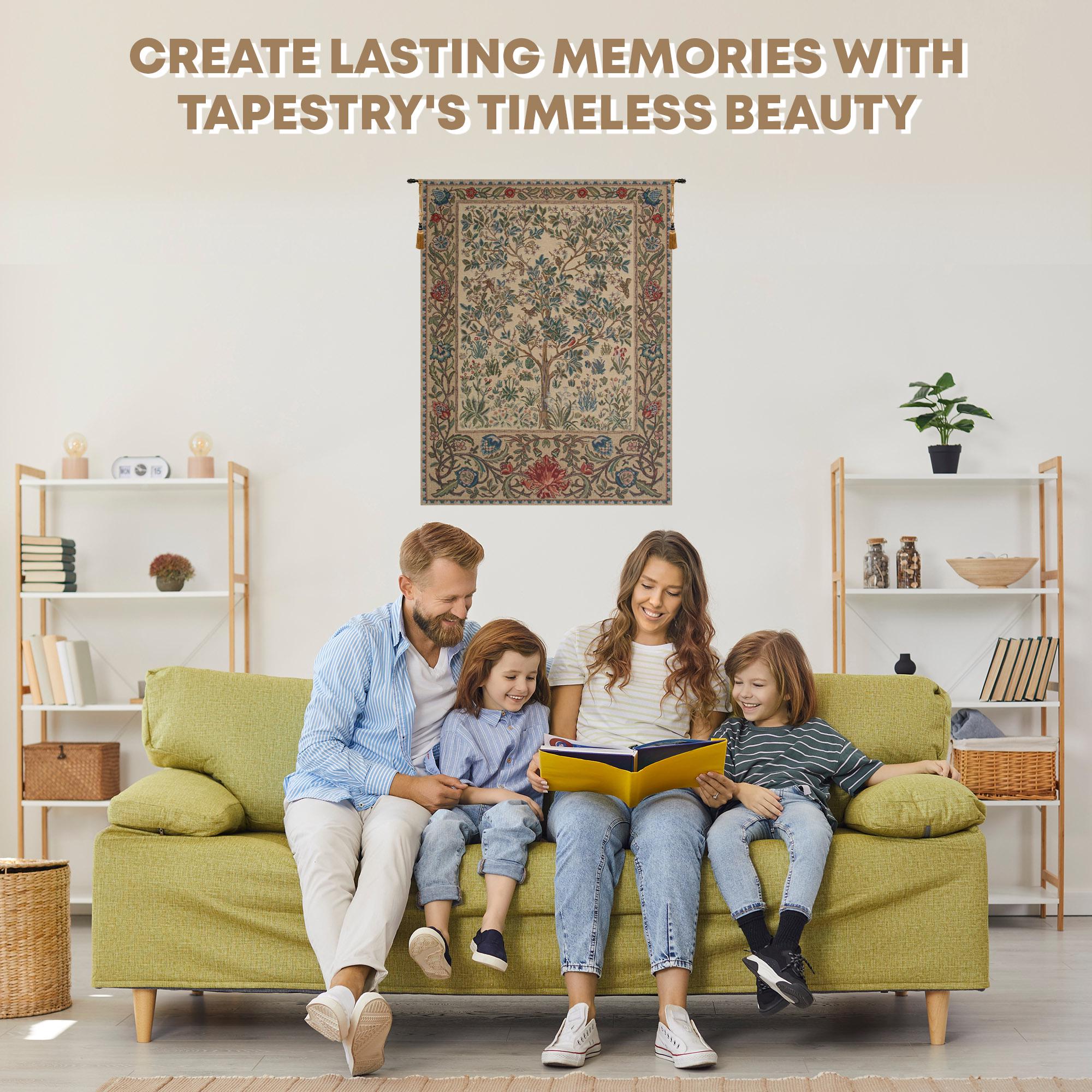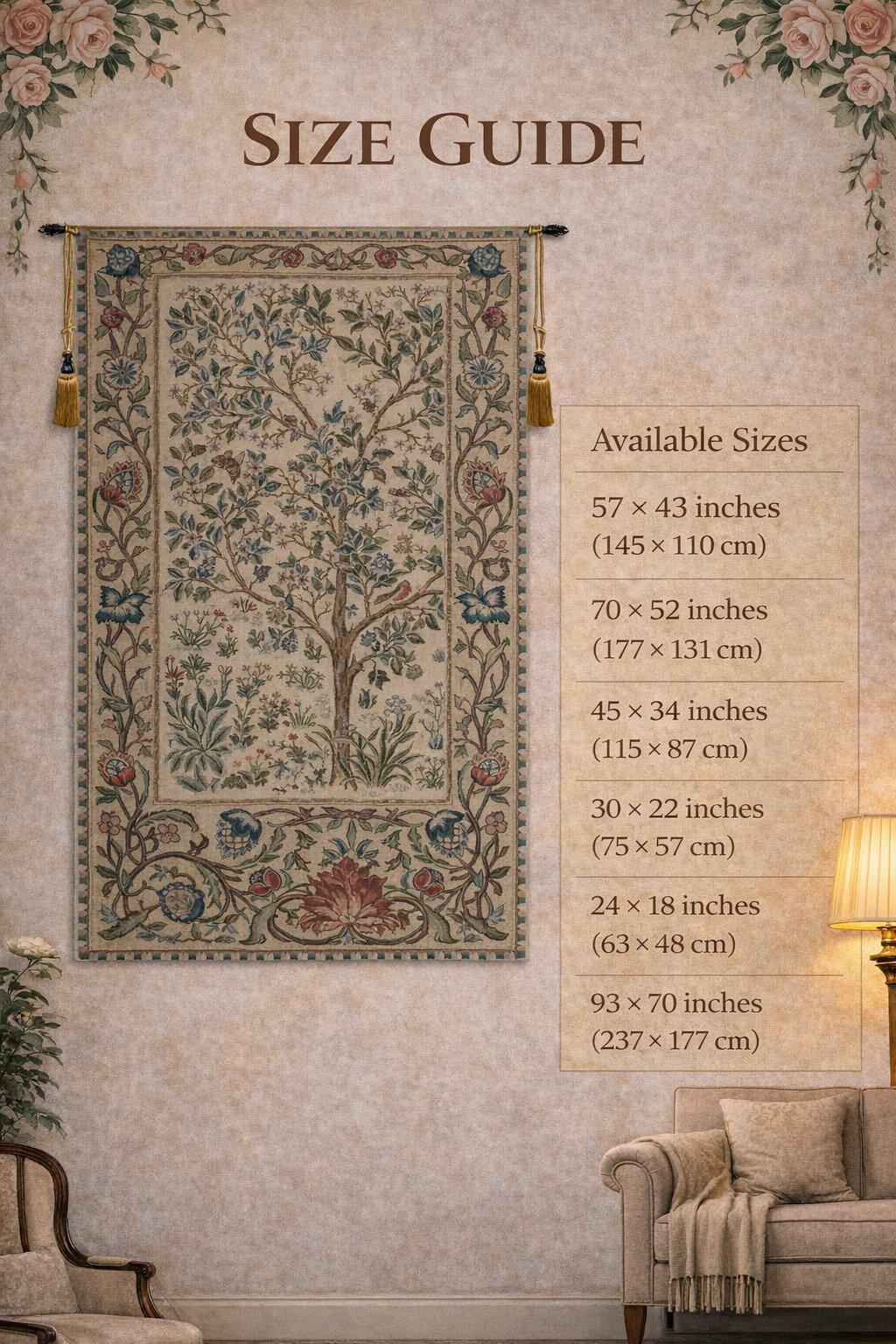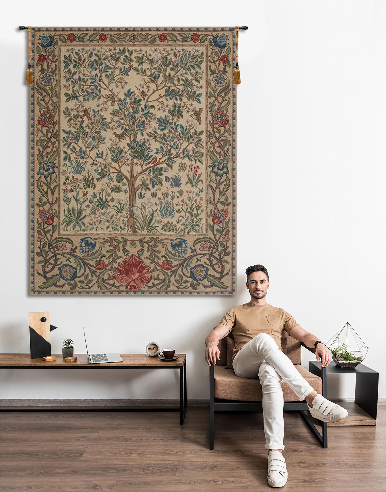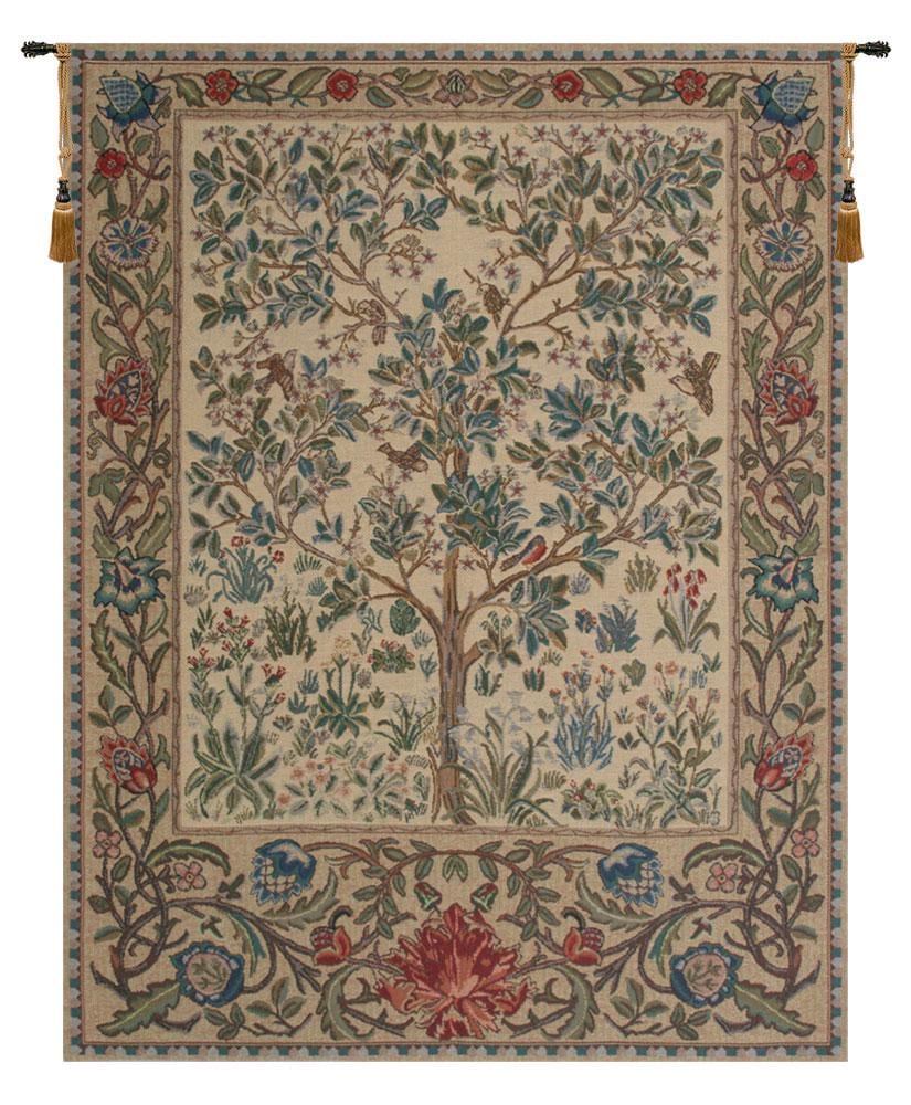 ๐๐ก๐ ๐๐ซ๐๐ ๐จ๐ ๐๐ข๐๐ ๐๐๐ข๐ ๐ ๐๐๐ฅ๐ ๐ข๐๐ง ๐ญ๐๐ฉ๐๐ฌ๐ญ๐ซ๐ฒ shows a Tree of Life design based on William Morris. This tree of life tapestry shows the treee with elegant and stylish blue green leaves, among a flurry of activity of birds flying and hovering in the scene to capture a moment in nature as a crisp, clean scene to celebrate nature itself. The tree symbolises eternal life, life force of nature, the strength and beauty of nature and mother nature energy. In this piece, the reds and blues of the piece contrasts beautifully with the beige and browns.