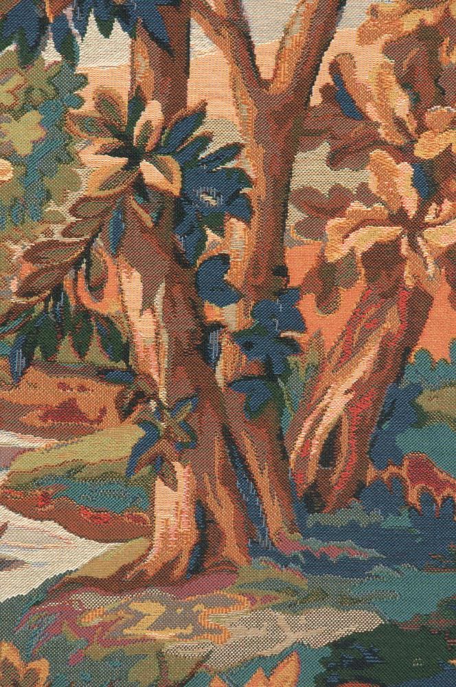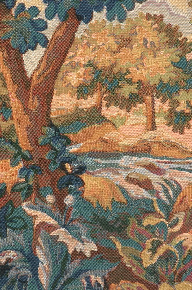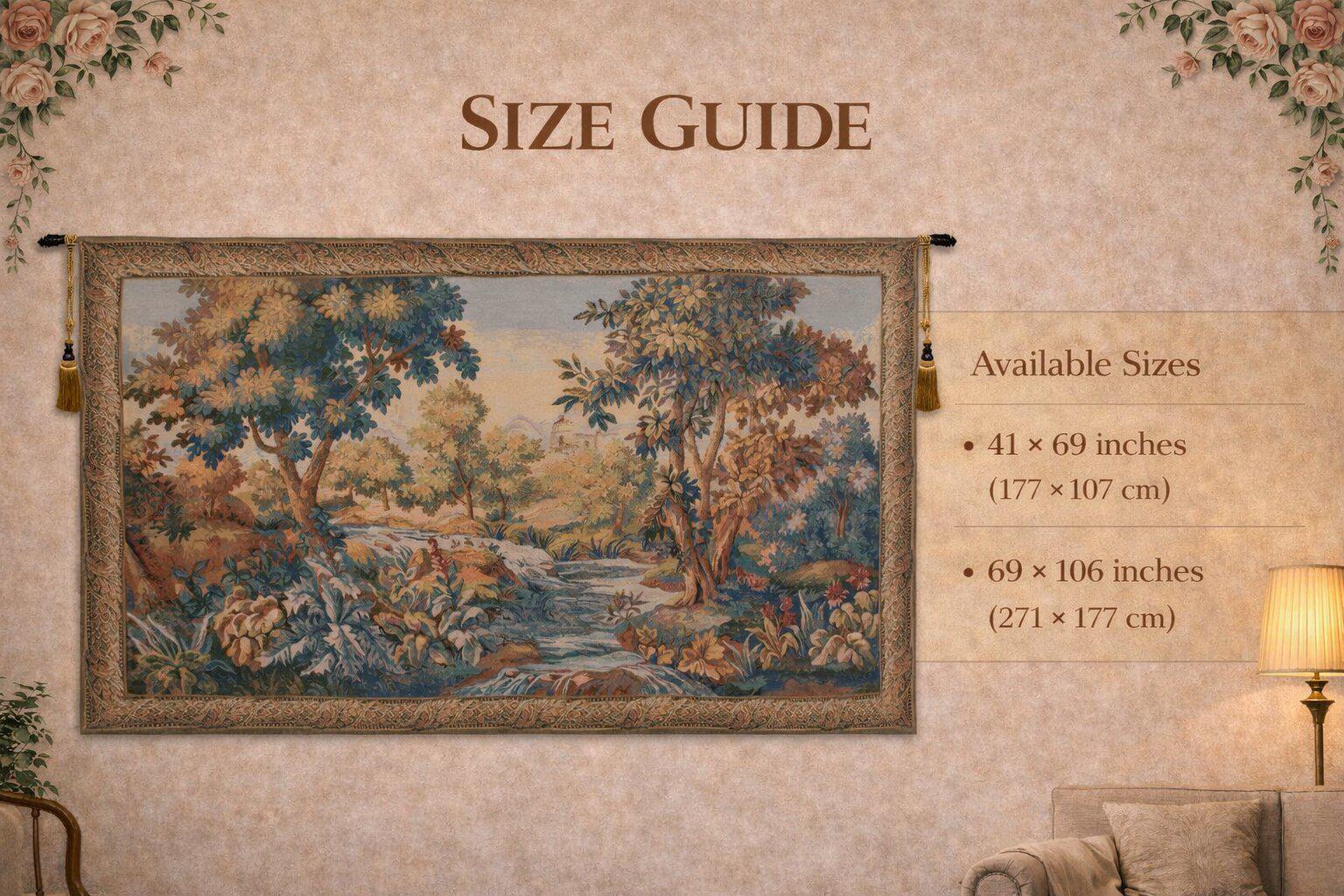Inspired by traditional French verdure designs, this tapestry captures a peaceful countryside scene with layered trees, flowing water, and rich earthy tones. The detailed composition brings depth and movement, making it a striking focal point for interiors styled with vintage, classical, or medieval influences.