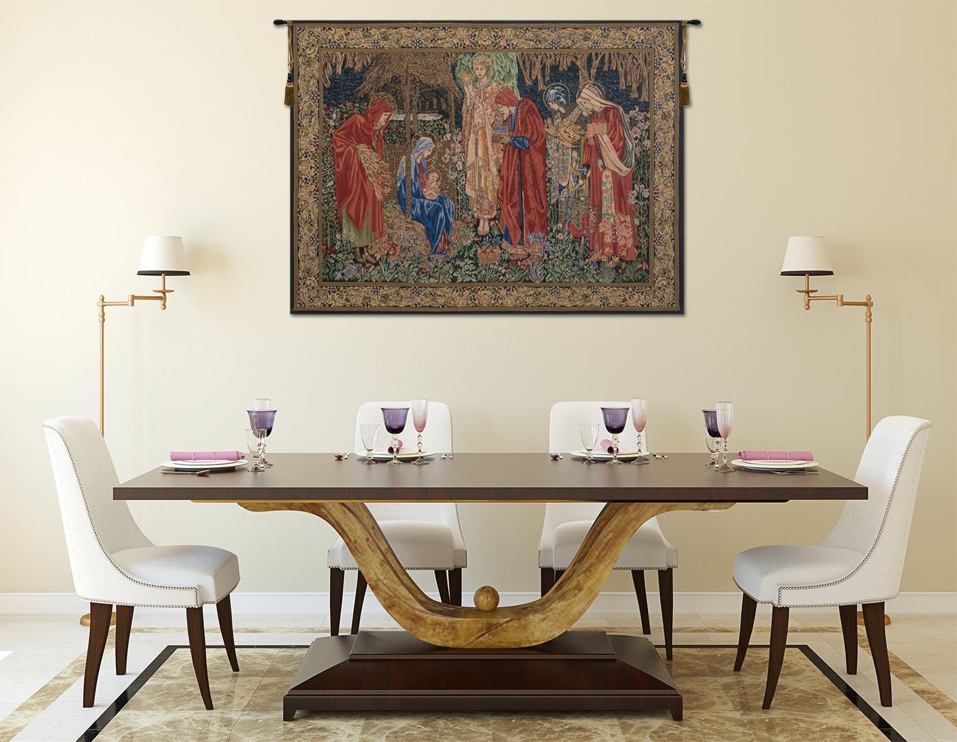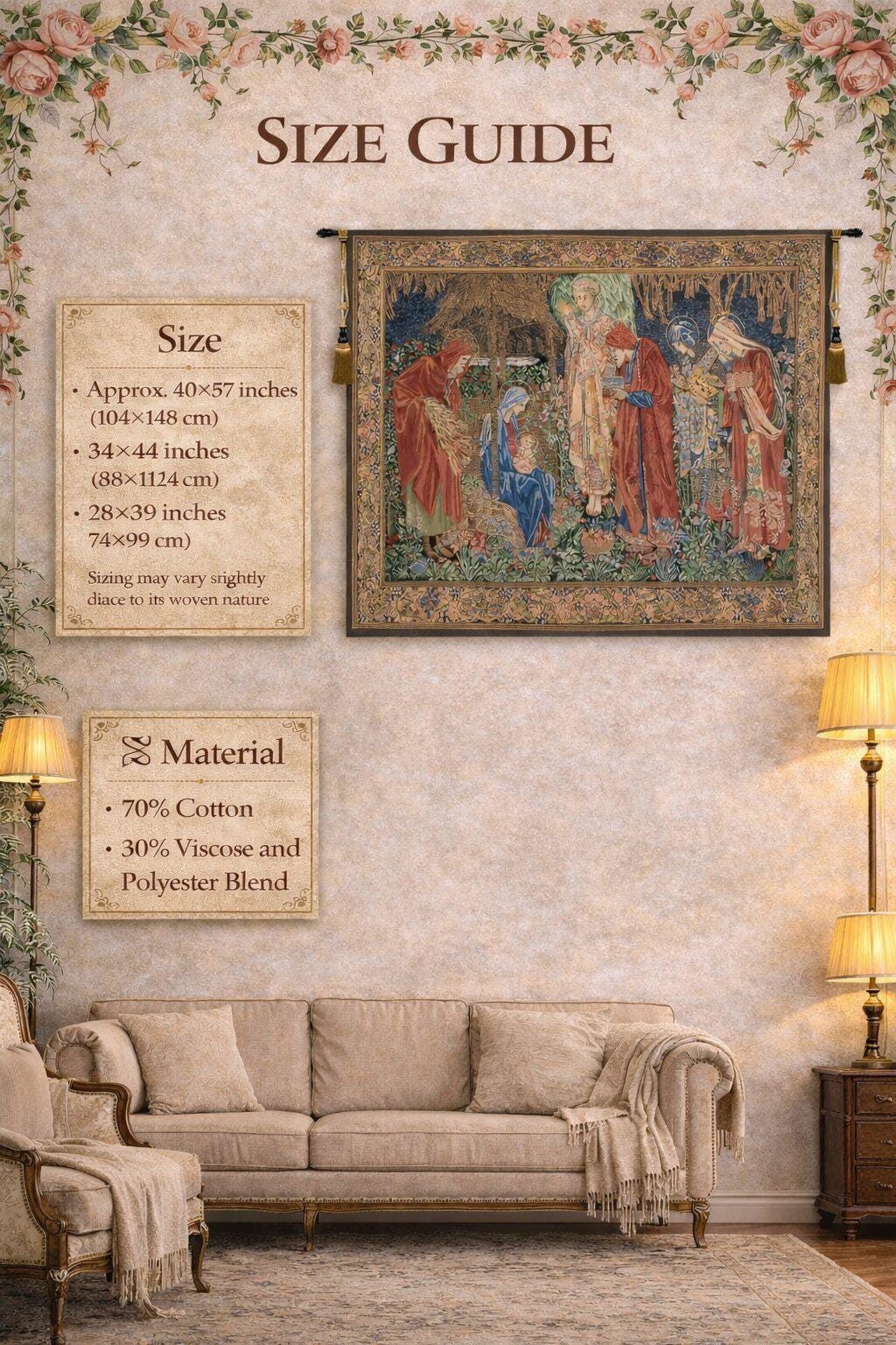 Inspired by the masterpiece of Edward Burne-Jones and William Morris, this tapestry captures the iconic moment of the Three Kings presenting gifts to the newborn Christ. The intricate composition, detailed figures, and deep color palette reflect the beauty of historical textile art, making it a striking focal point for traditional, religious, or heritage-inspired spaces.