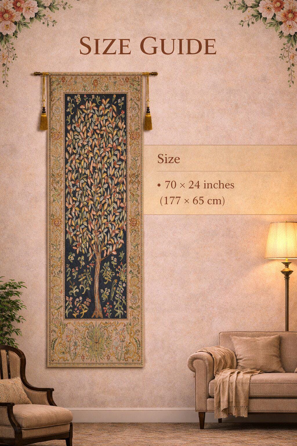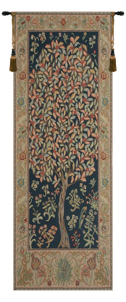 Inspired by the timeless work of William Morris, this vertical tapestry showcases the Tree of Life surrounded by delicate leaves and mille fleurs details. The soft pastel palette creates a serene and balanced look, ideal for cozy, nature-inspired interiors and vintage-style homes.