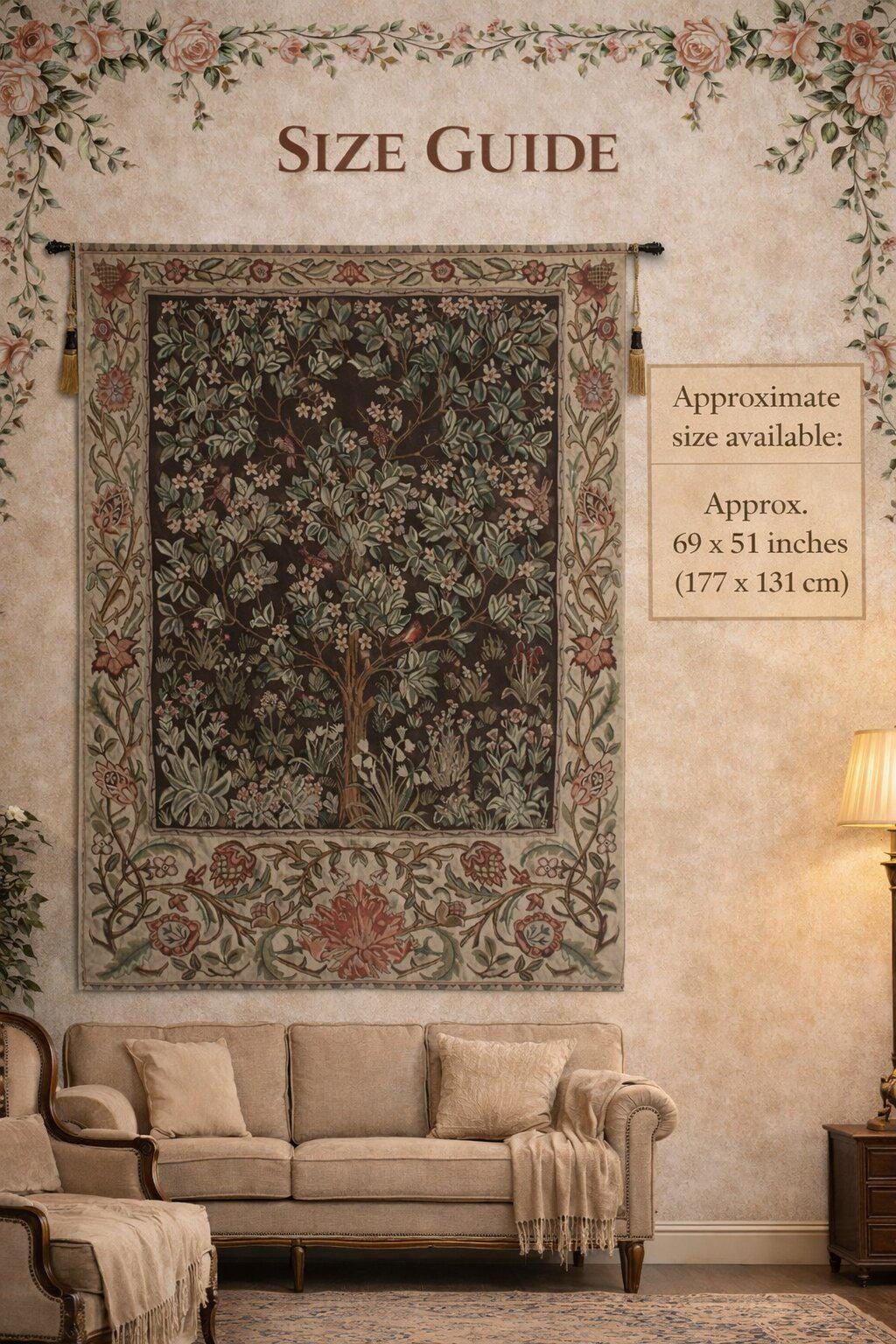 Bring timeless artistic charm into your home with this William Morris Tree of Life tapestry wall hanging, a beautifully detailed vintage botanical woven tapestry inspired by the Arts and Crafts movement. Featuring intricate floral patterns, birds, and foliage surrounding the symbolic Tree of Life, this Belgian woven tapestry wall decor adds a rich, heritage aesthetic to living rooms, bedrooms, hallways, or gallery walls.