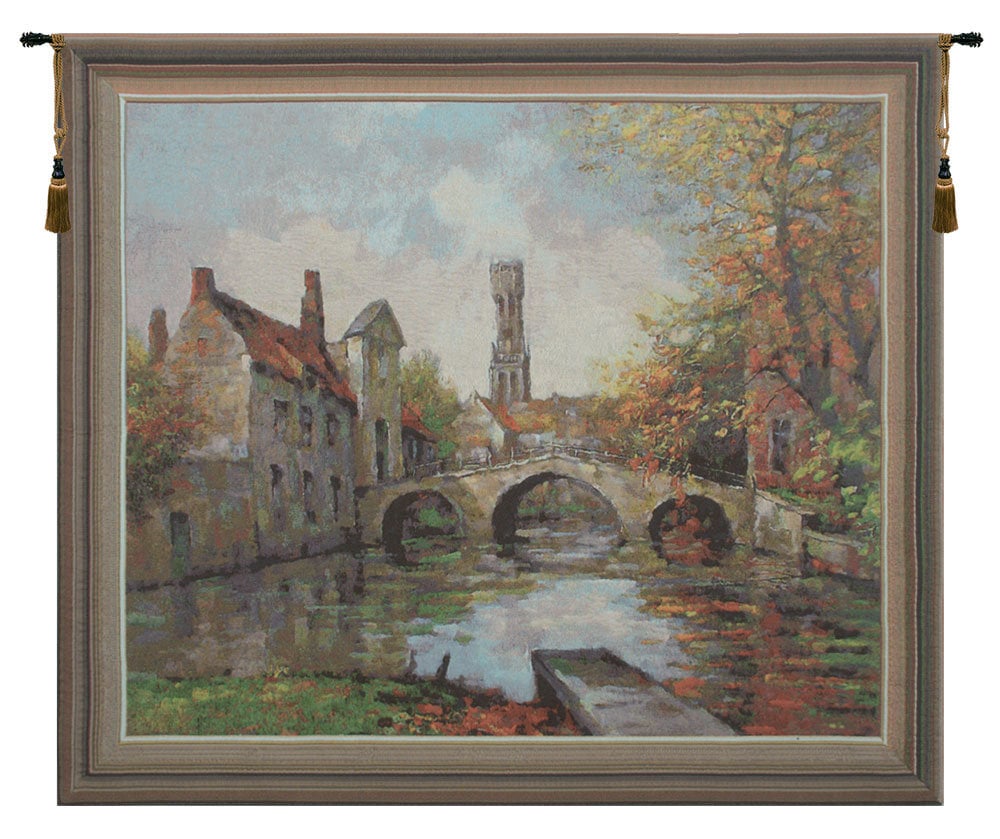 The Lake of Love European wall tapestry takes inspiration from the work of V. Houben. This elegant tapestry portrays the scenic view of a place located in Bruges, Belgium. The Belgian tapestry wall art showcases a lake with a bridge and a few buildings. It is said to be a famous place where people express their feelings for each other.