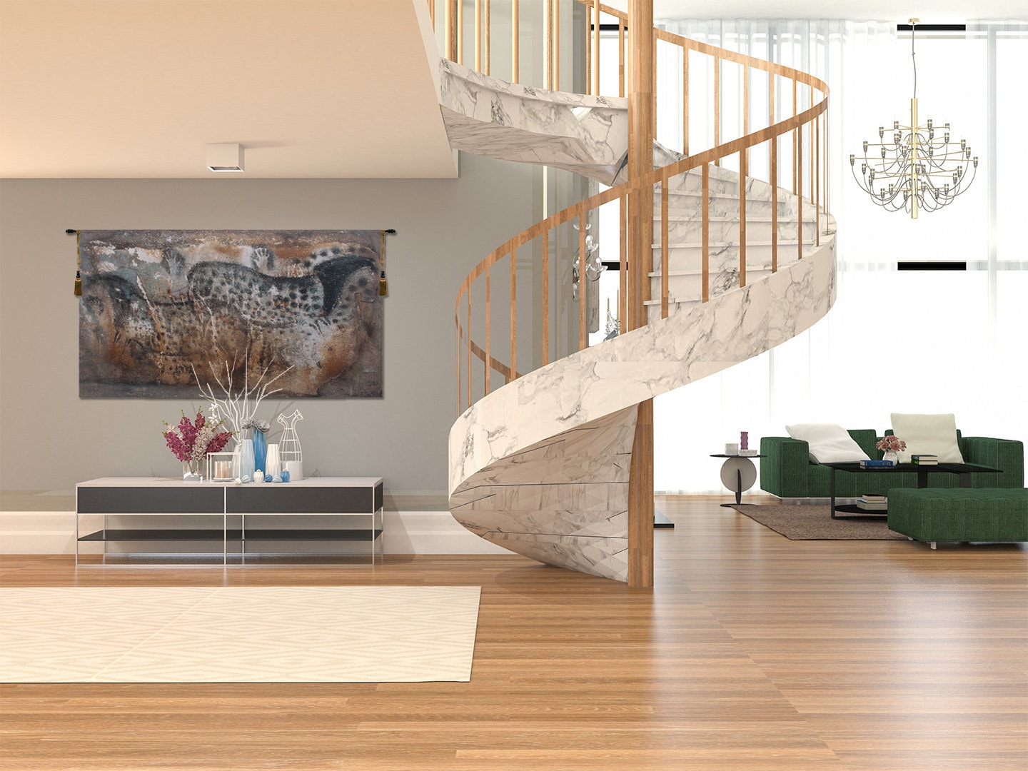 Step back into the ancient world with the Hands and Horses European Wall Tapestry, a captivating Belgian jacquard wall hanging inspired by the renowned Pech-Merle Cave paintings of Cabrerets, France. This remarkable artwork recreates the famous prehistoric composition featuring two near life-size dappled horses โ an extraordinary example of Stone Age artistry and human imagination.