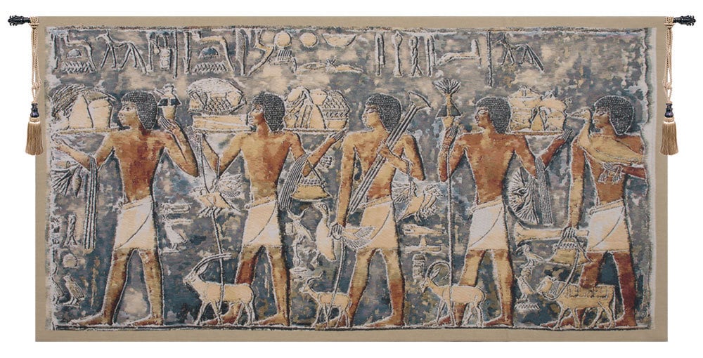 This fine art wall tapestry, Saqqarah Blue Part 2, is jacquard woven in Belgium. It represents the giving of sacrifices to the deceased Pharoh. The original artwork is displayed on the tomb of Ptahotep (or Ptah-hotep) in Sakkarah. It dates from the Ancient Egyptian Empire 2650-2150 BCE. Saqqara (or Sakkara, Saqqarah, Sakkarah) is a vast, ancient burial ground in Egypt, featuring the world's oldest standing step pyramid. A perfect accent to your home decor motif.