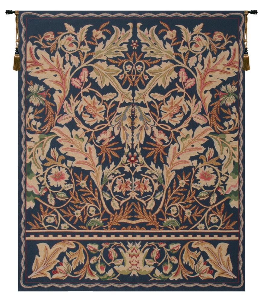 "This Belgian woven floral tapestry features flowing botanical patterns on a deep blue background.