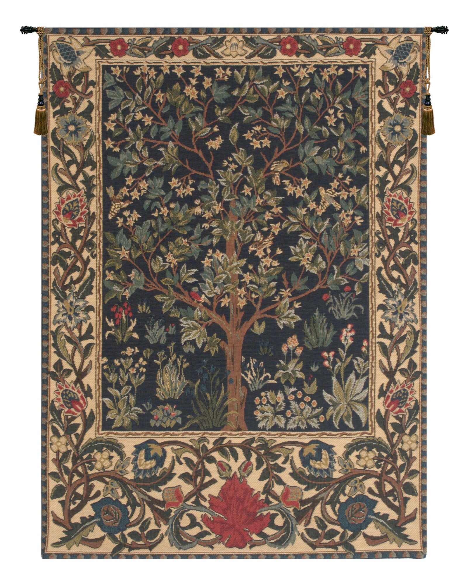 Tree of Life I is a European jacquard wall tapestry. The artwork is by William Morris, 1834 - 1896. Despite his ambition to be a painter and his later reputation as writer, poet, publisher, political thinker and activist, Morris is most widely known as a designer of patterns in which he combines historical themes with floral patterns. This tree of life incorporates the medieval style of mille-fleurs.