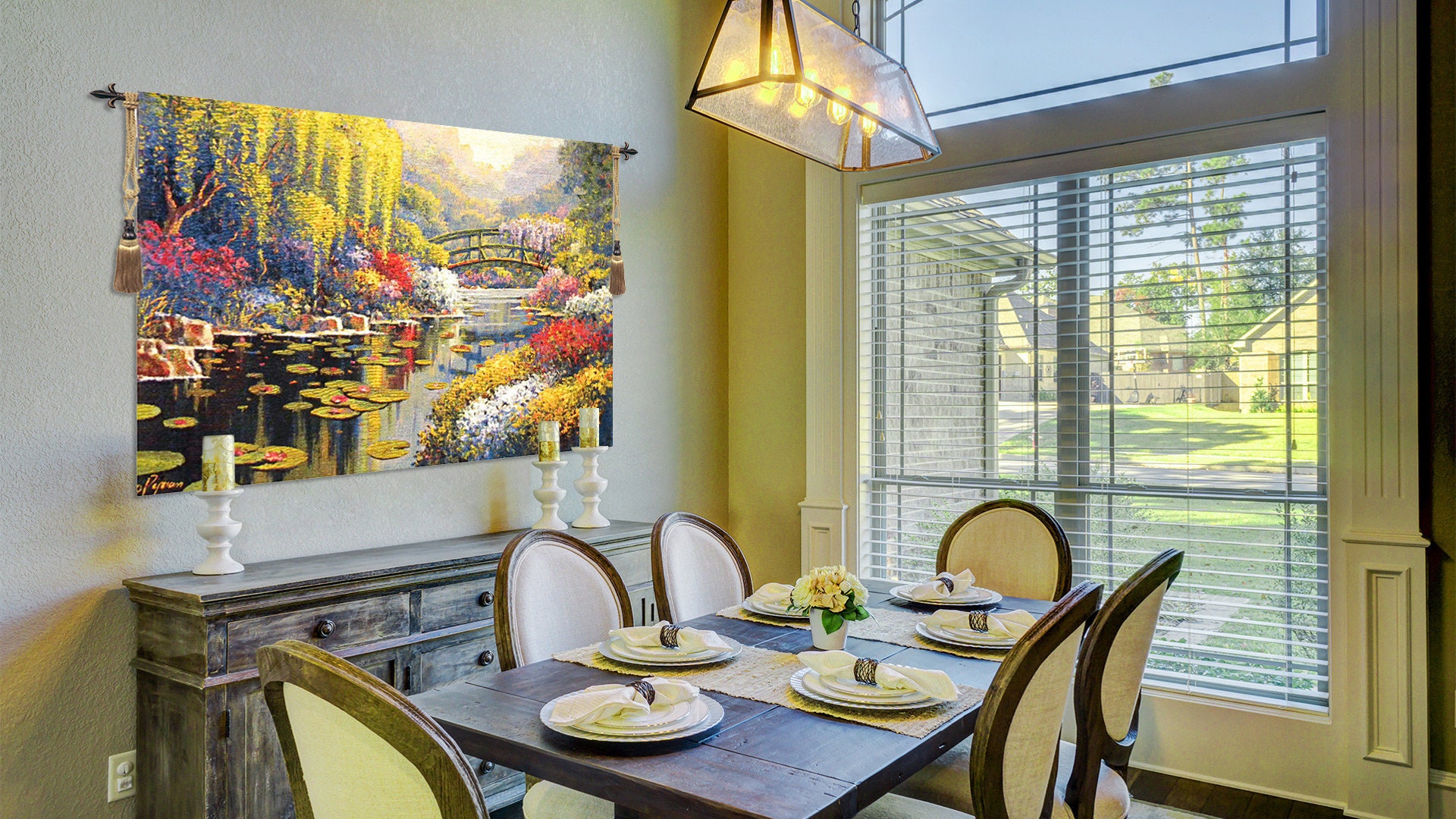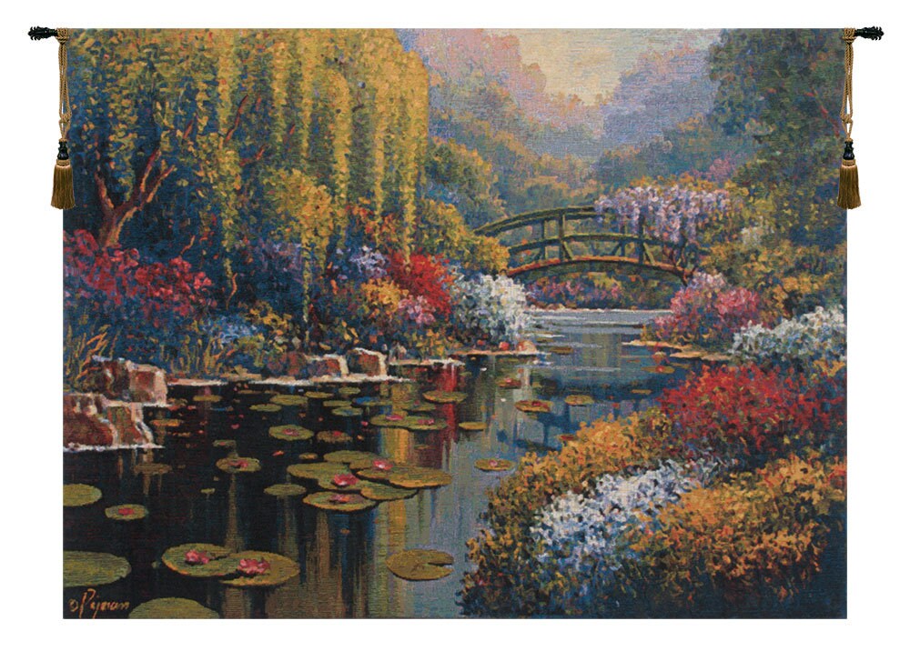 Giverny Pond European wall tapestry is a beautiful and magnificent wall decor art. It depicts the image of a beautiful landscape with a pond, willow trees, various flora and a classical bridge crossing It is the most common image that pops up when one thinks of the scenic wild natural landscape.