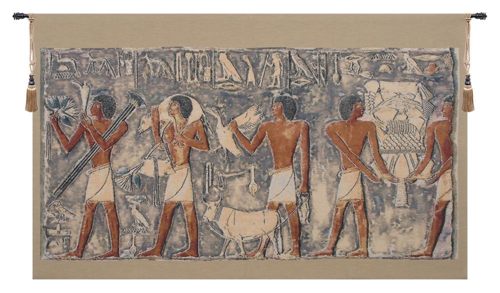 This woven tapestry illustrates the giving of sacrifices to the deceased Pharaoh, inspired by the original wall relief in the Tomb of Ptahotep at Saqqara, Egypt. Dating from the Ancient Egyptian Empire (2650โ2150 BCE), the artwork is a tribute to divine reverence, eternal life, and ritual offerings.