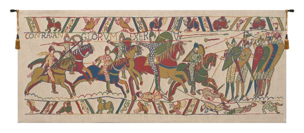 ๐ง๐ต๐ฒ ๐๐ฎ๐๐๐น๐ฒ ๐๐ฎ๐ฐ๐พ๐๐ฎ๐ฟ๐ฑ ๐ช๐ผ๐๐ฒ๐ป ๐ง๐ฎ๐ฝ๐ฒ๐๐๐ฟ๐. Crafted in Belgium, this wall hanging is a faithful reproduction of the legendary 11th-century Bayeux Tapestry, which chronicles the Norman conquest of England by William the Conqueror in 1066 at the Battle of Hastings. The original tapestry, an extraordinary 70 meters in length, is preserved in the Museum of Bayeux in France.