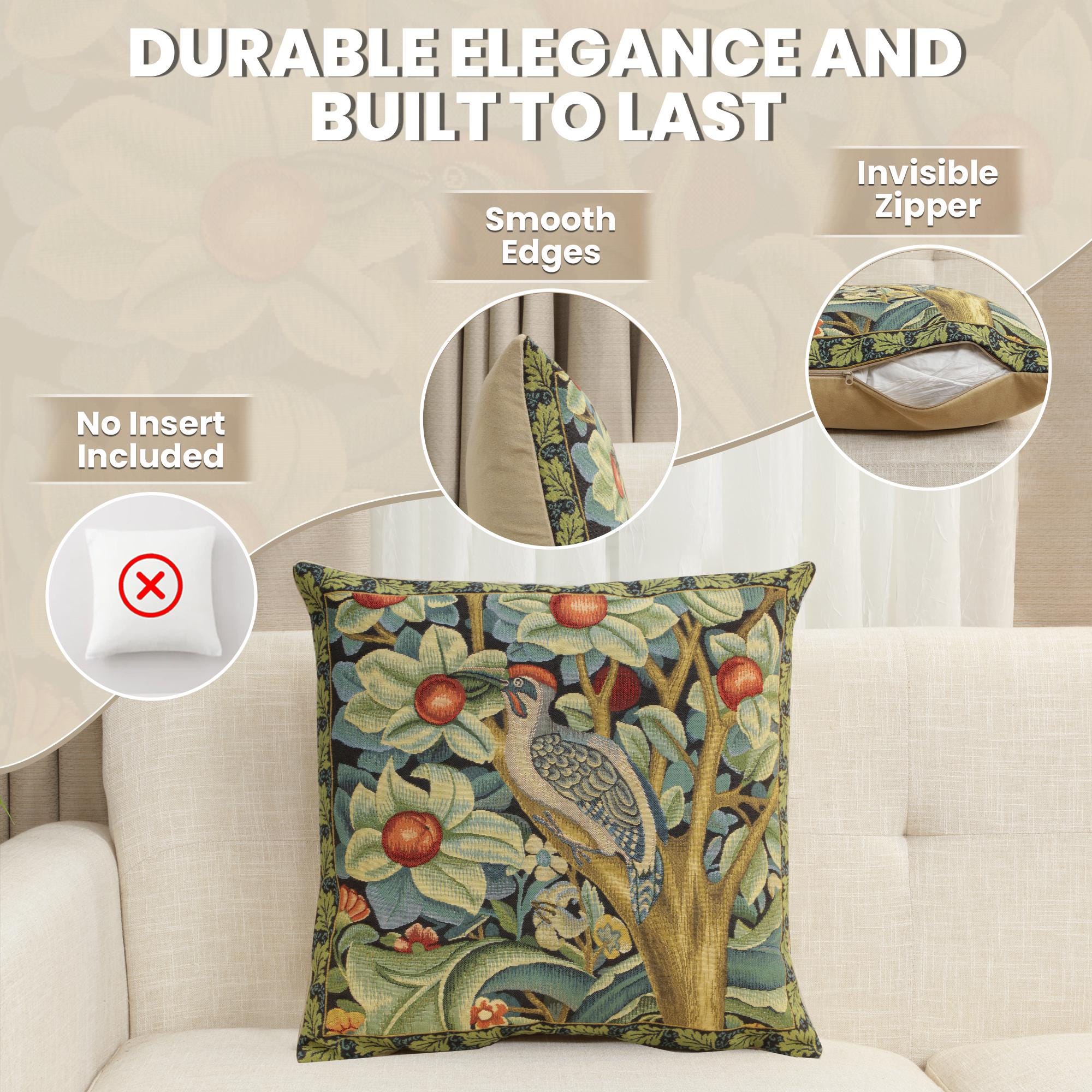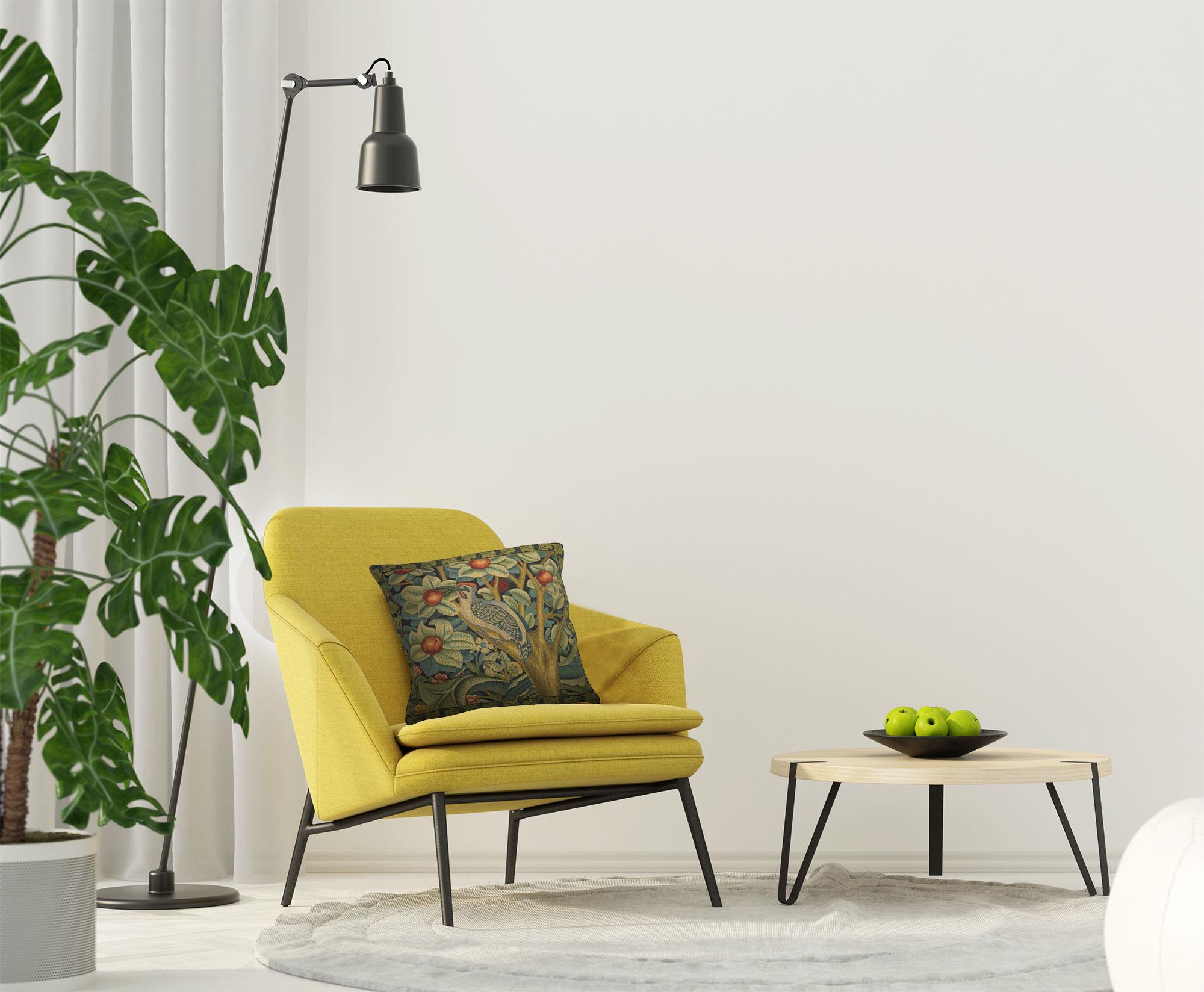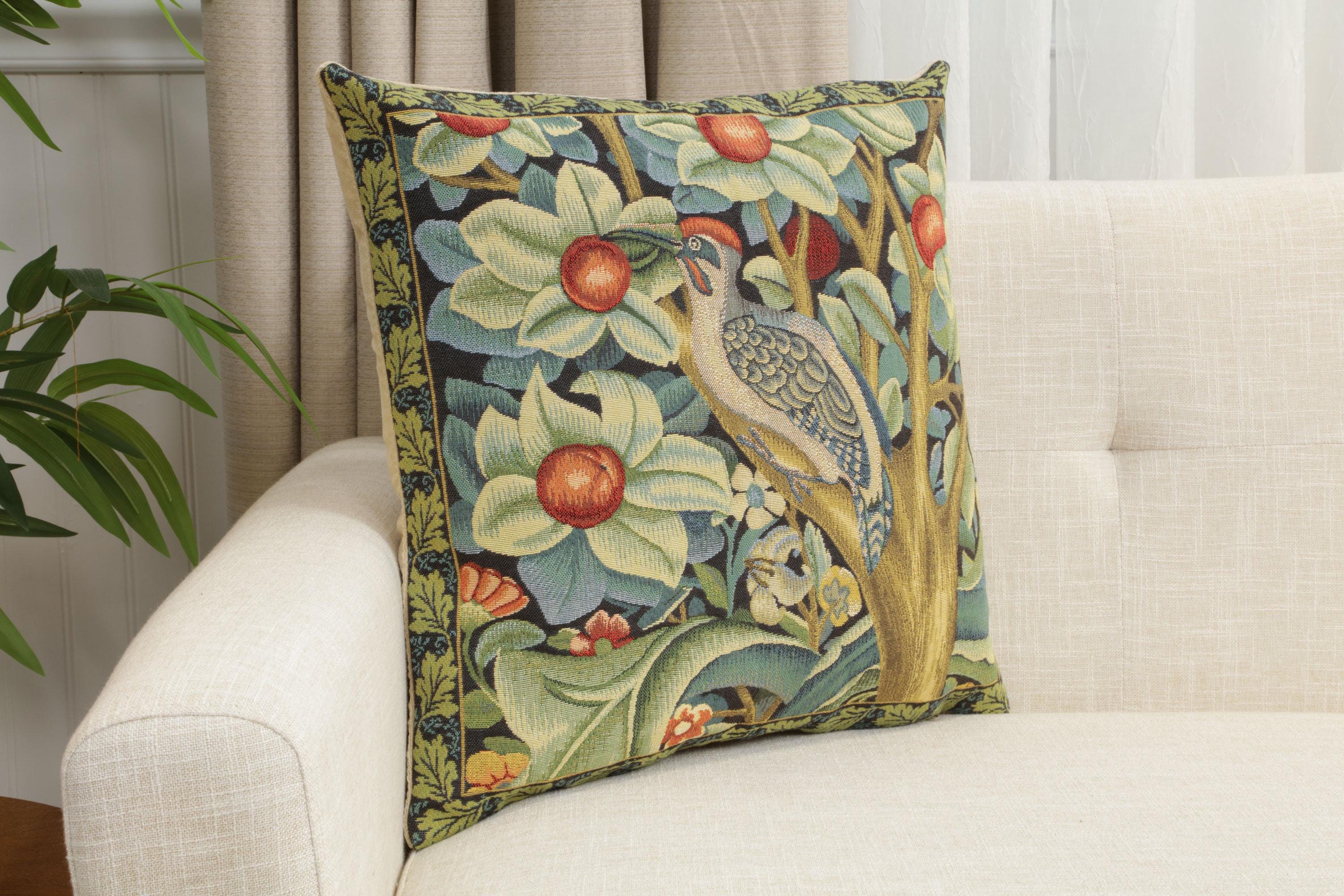 Bring nature into your home with timeless artistry. Transform your living space with the Woodpecker throw pillow covers, a beautiful tribute to William Morris's artistic legacy. This woven pillow cover features a charming woodpecker perched amid a lush, medieval floral backdrop, bringing a serene, sophisticated vibe to your decor.