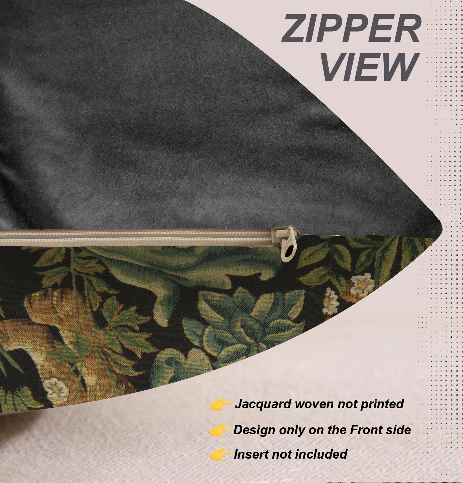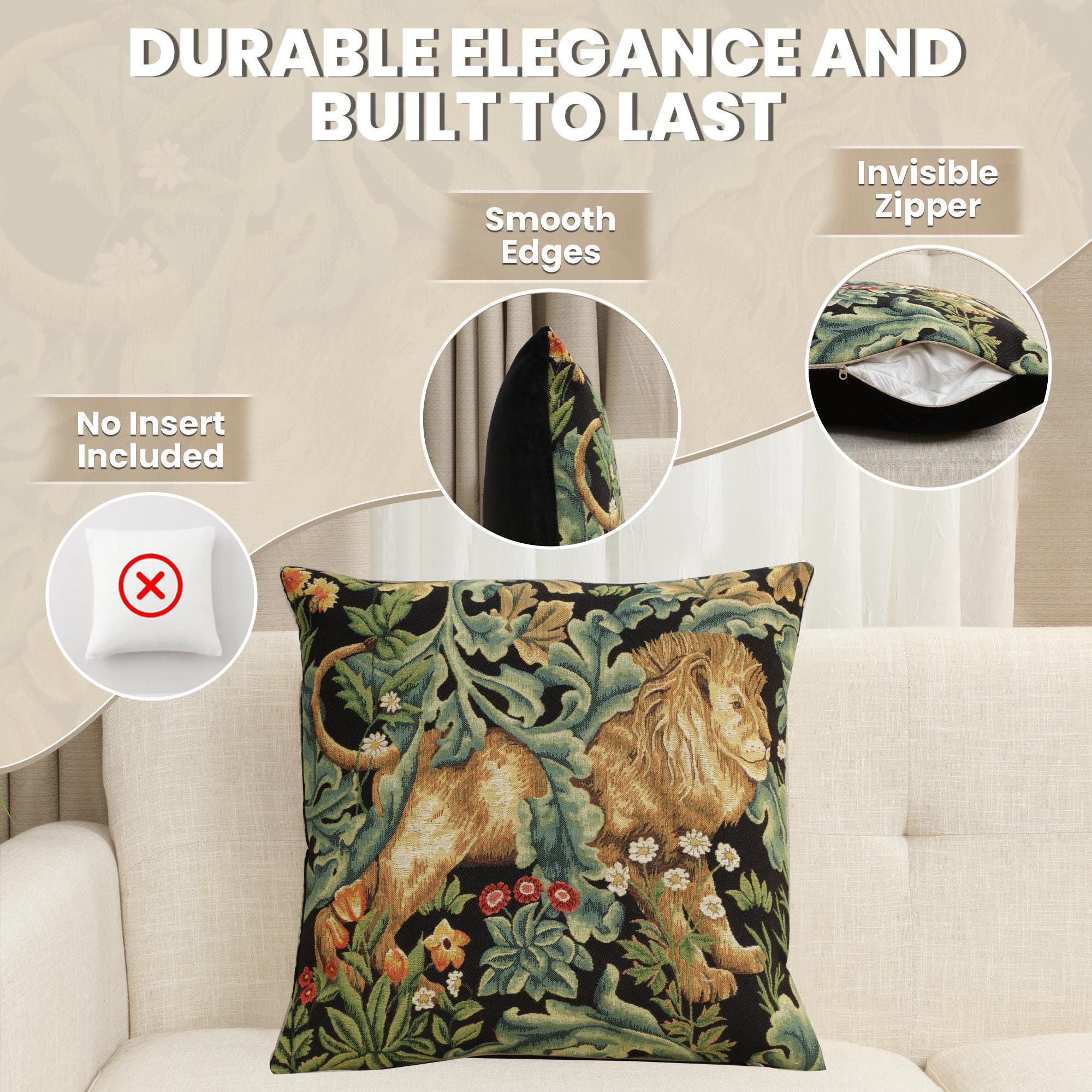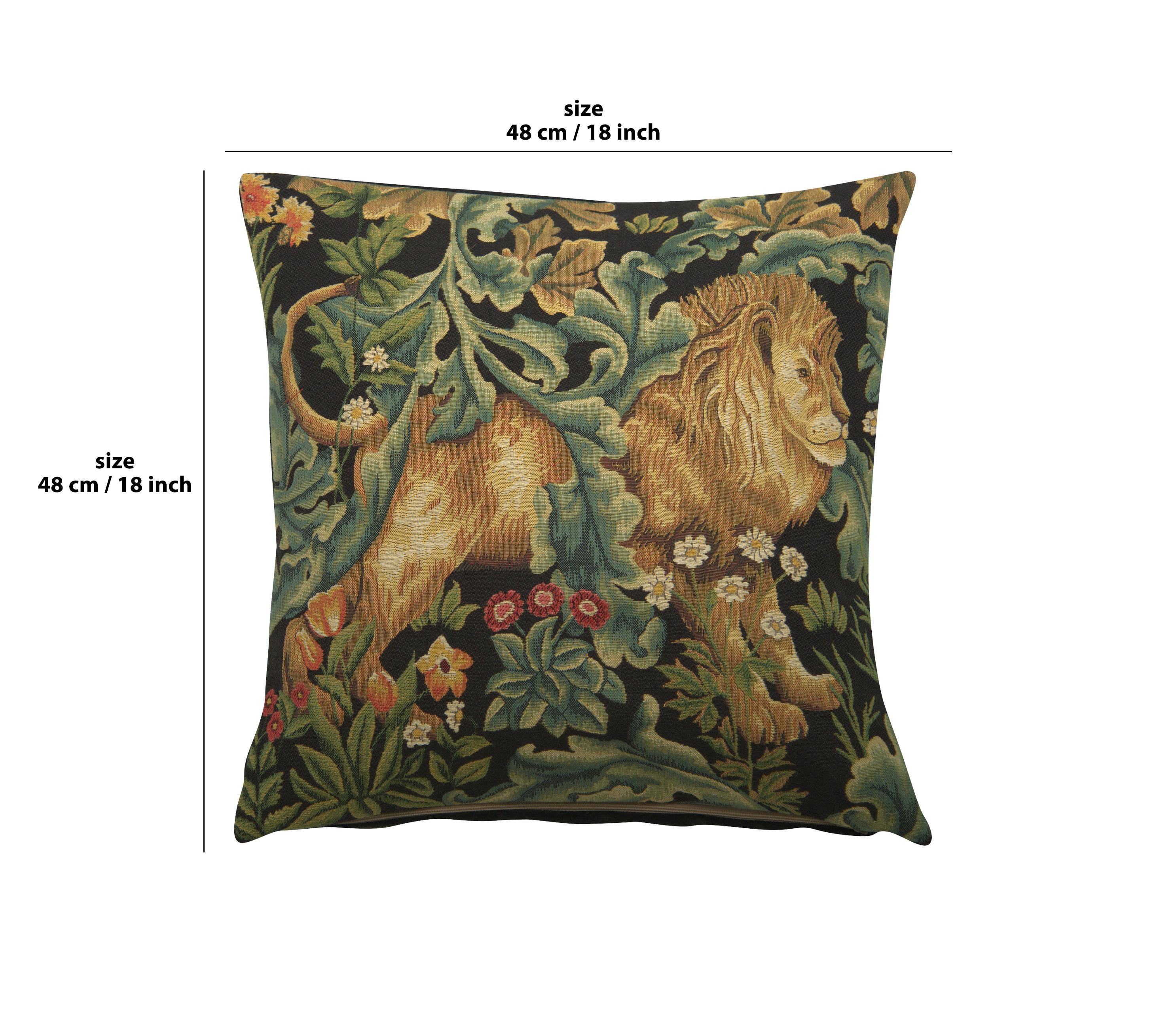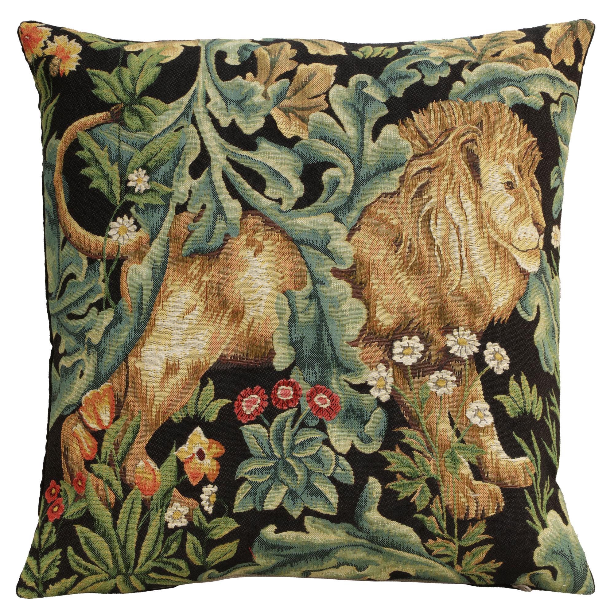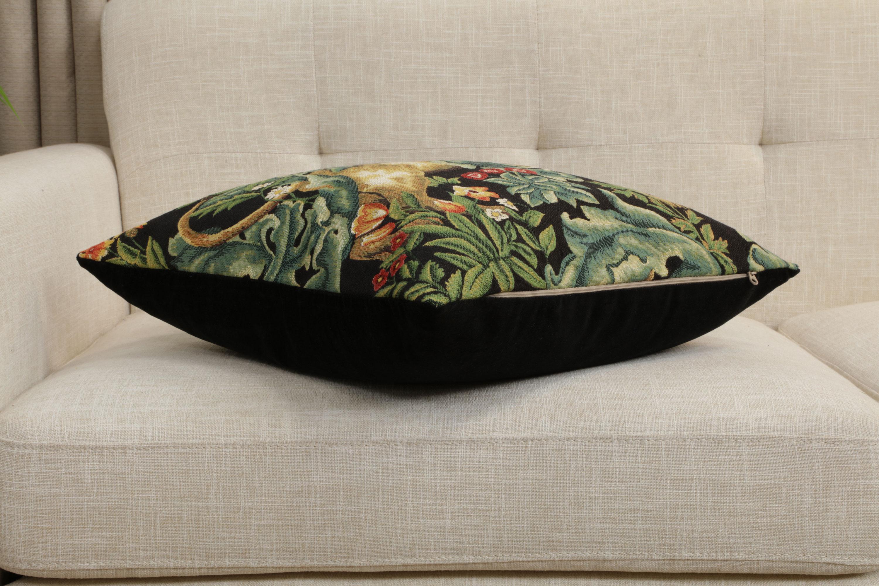 Fierce and formidable, the king of the jungle depicted on our Lion by William Morris cushion cover brings the beauty and brawn of this fierce beast to your décor. This Arts & Crafts woven décor reflects the intricate weaving of the later 1800s when Morris founded the movement. It features a lion in the center surrounded by flora, vines, and a jungle setting. This visually striking pillow cover is sure to make a statement when paired with solid velvet pillows in coordinating colors. Cushion cover backed with lining and zipper. Infill not included. Woven in France.