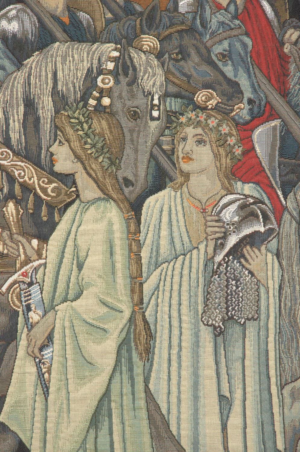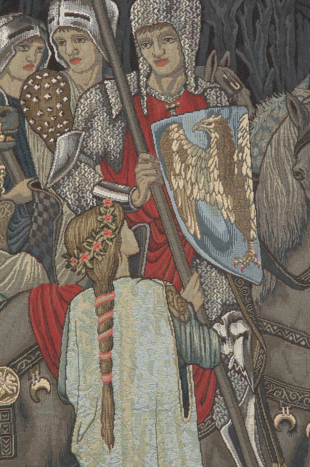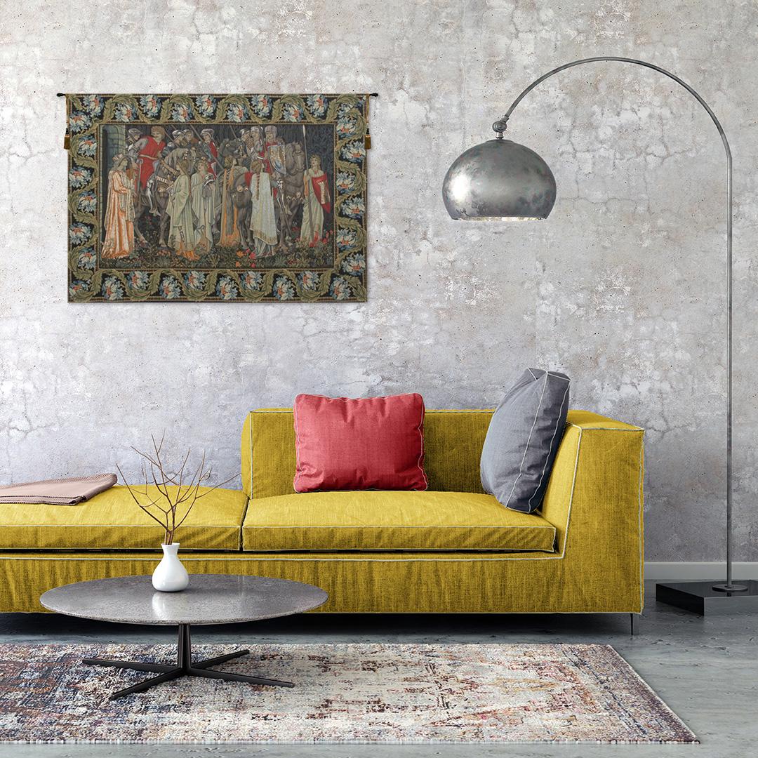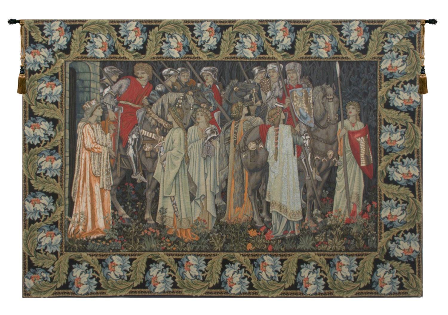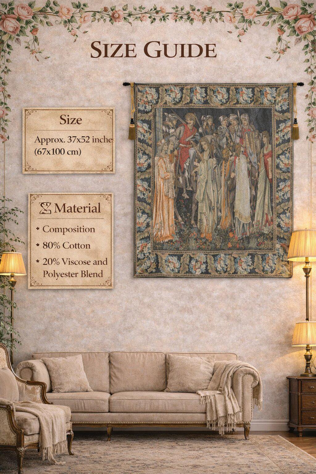 Inspired by the legendary designs of Edward Burne-Jones and Morris & Co., this tapestry illustrates the iconic scene of the Knights of the Round Table preparing for the Quest for the Holy Grail. The composition is filled with intricate figures, ornate armor, and symbolic elements, capturing the essence of medieval European artistry and storytelling.